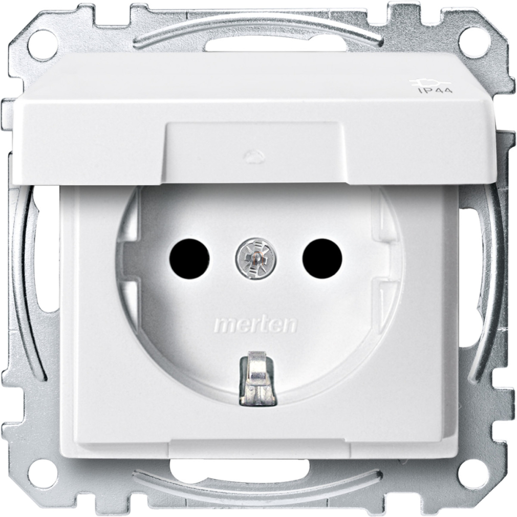 MERTEN 2P+F csatlakozóaljzat, biztonsági zsaluval, csapófedéllel, csavaros, 16A, IP44, System-M, mattfehér MEG2414-0419 Schneider
