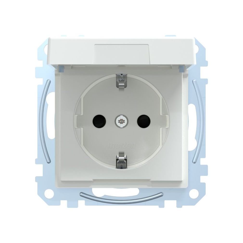 MERTEN 2P+F csatlakozóaljzat, biztonsági zsaluval, csapófedéllel, rugós, 16A, IP44, System-M, aktívfehér MEG2314-0325