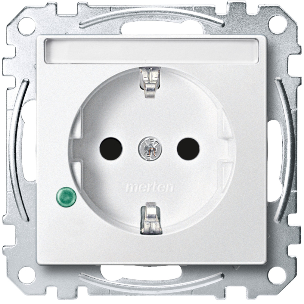 MERTEN 2P+F csatlakozóaljzat, biztonsági zsaluval, túlfesz-korlátozóval, feliratozható, rugós, 16A, System-M, mattfehér MEG2305-0419 Schneider