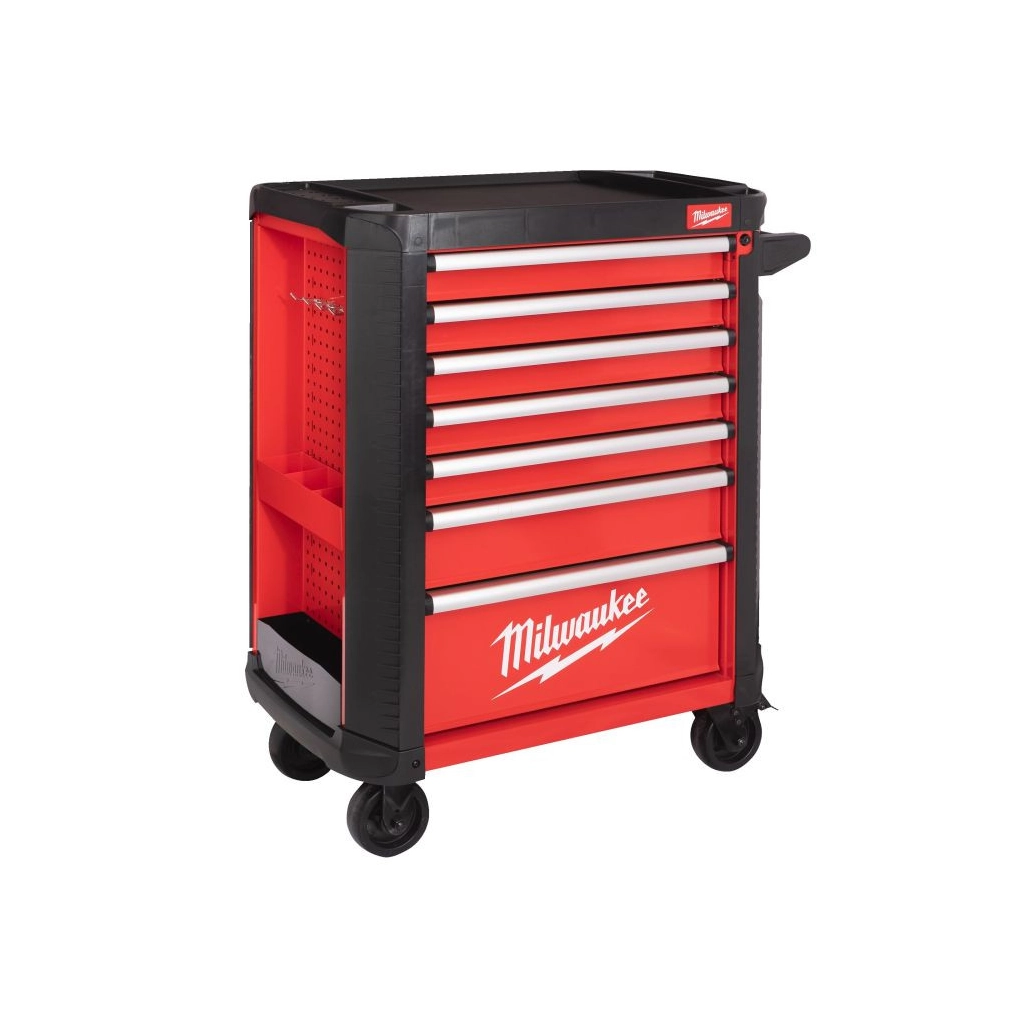 Milwaukee 30/78 cm 7 fiókos acél szerszámkocsi 4932478849\n45 kg-ig terhelhető, lágyan záródó fiókok.\n90 kg-ig terhelhető alsó fiók.\nEldőlés elleni védelem - egyszerre 1 fiók nyitható.\nMinden fiók csúszásgátló betéttel van ellátva.\nSüllyesztett, sima felületű ABS munkalap csavarhúzó furatokkal és további rekeszekkel.\nSarokvédők ütődés ellen.\nMágneses elosztó lehetővé teszi az akkumulátorok töltését közvetlenül a szekrényen.\nSzerszámtároló oldalfal kampókkal és tárolókkal van ellátva a leggyakrabban használt szerszámok egyszerű eléréséhez.\nKihajtható polc palackok és spray-k tárolására.\nAlsó fiókban rendszerező elektromos szerszámgépekhez.\n125 mm-es kerekek (2 db fix, 2 db forgatható fékkel).\n800 kg terhelési kapacitás.\n\n