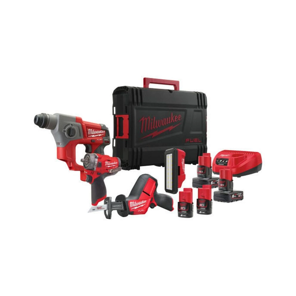 Milwaukee M12 FPP4C-624P erőcsomag 4933492515, A csomag tartalma:, 1db M12 PAL forgatható lámpa,, 1db CH szuperkompakt SDS-PLUS kalapács,, 1db CHZ szuperkompakt kézifűrész,, 1db M12 FPDXKIT ütvefúró-csavarozó,, 2db tárolóláda,, 2db M12 B6 akkumulátor,, 2db M12 B2 akkumulátor,, 1db C12C töltő,