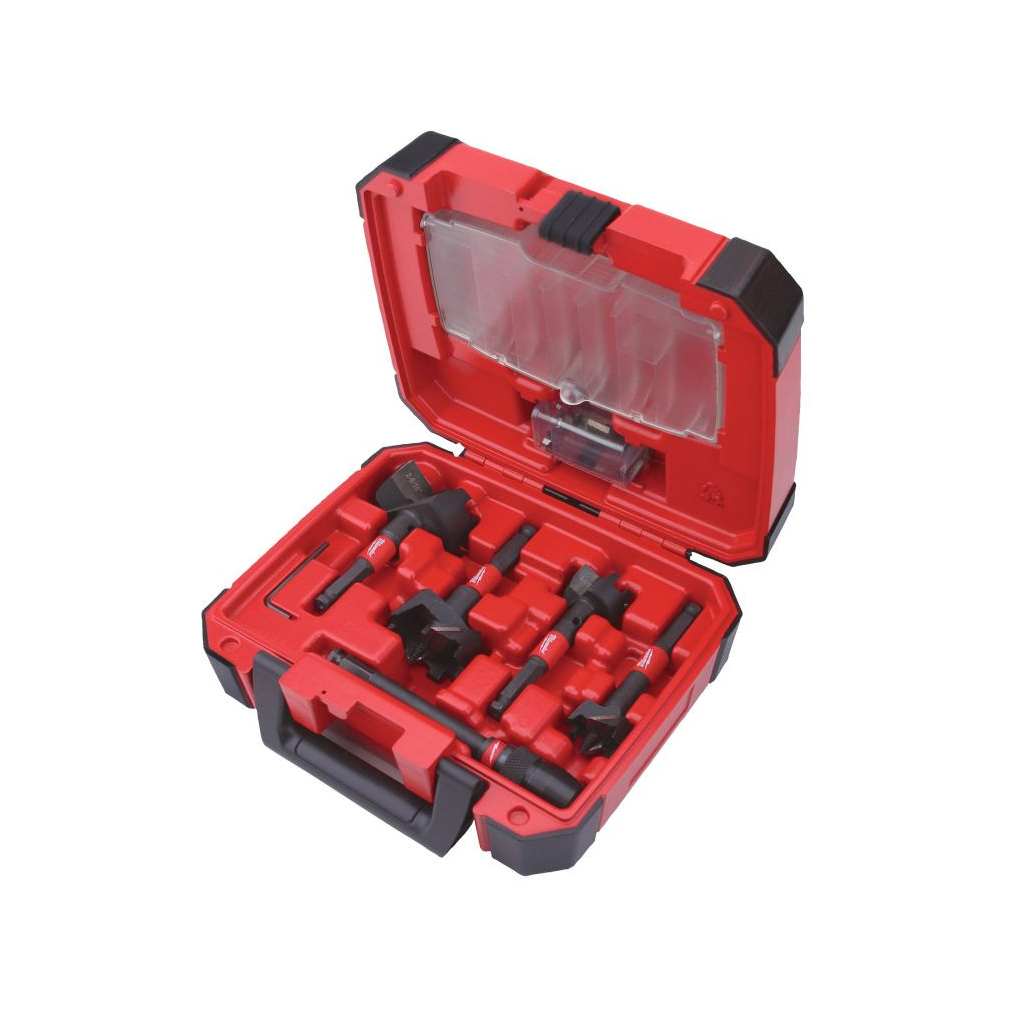 4 SWITCHBLADE™ öntolásos fúró ⌀ 35 / 38 / 54 / 65 mm, QUIK-LOK 140 mm-es toldószár, 4 x cserélhető SWITCHBLADE™ penge (minden méretből 1), 4 x előtoló csavarorsó, 4 x csavarkészlet, 1 x imbuszkulcs