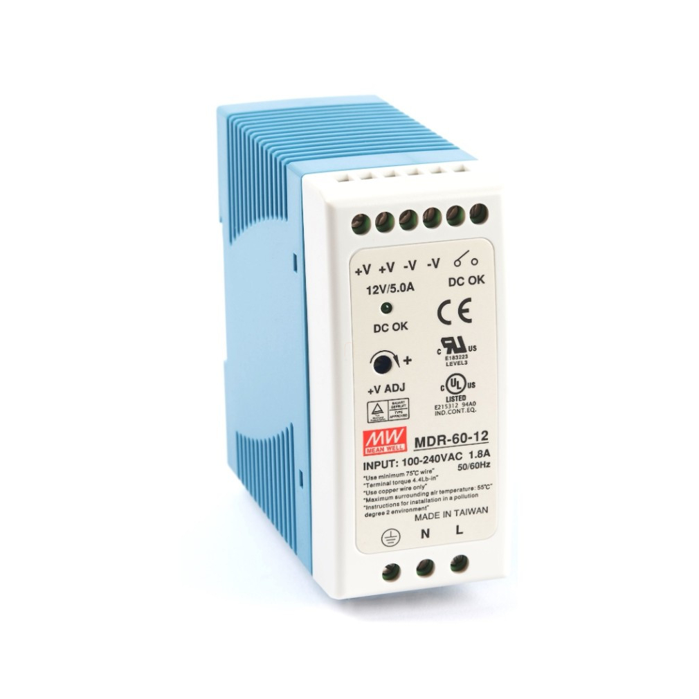 Mini kapcsolóüzemű tápegység, DIN sínre Vin: 85-264 VAC/120-370 VDC, Vout: 12 VDC (0-5A), P: 60 W Mean Well MDR-60-12