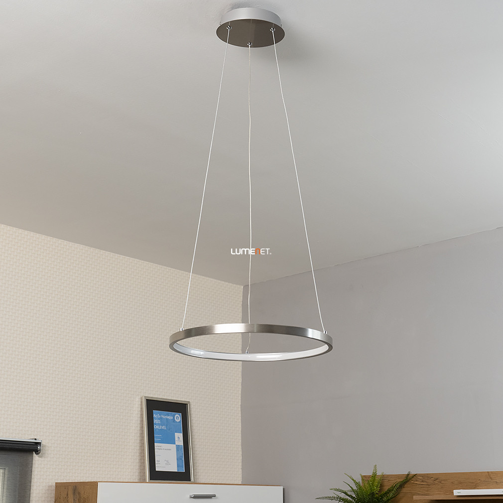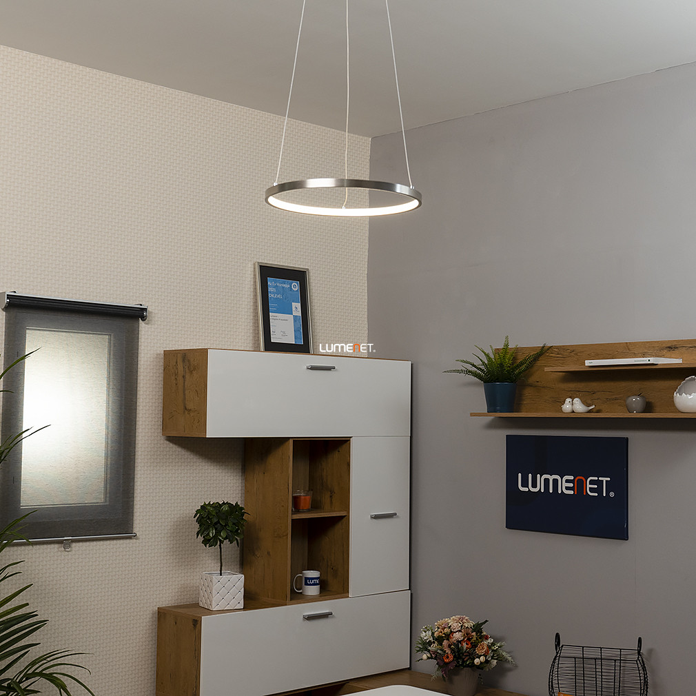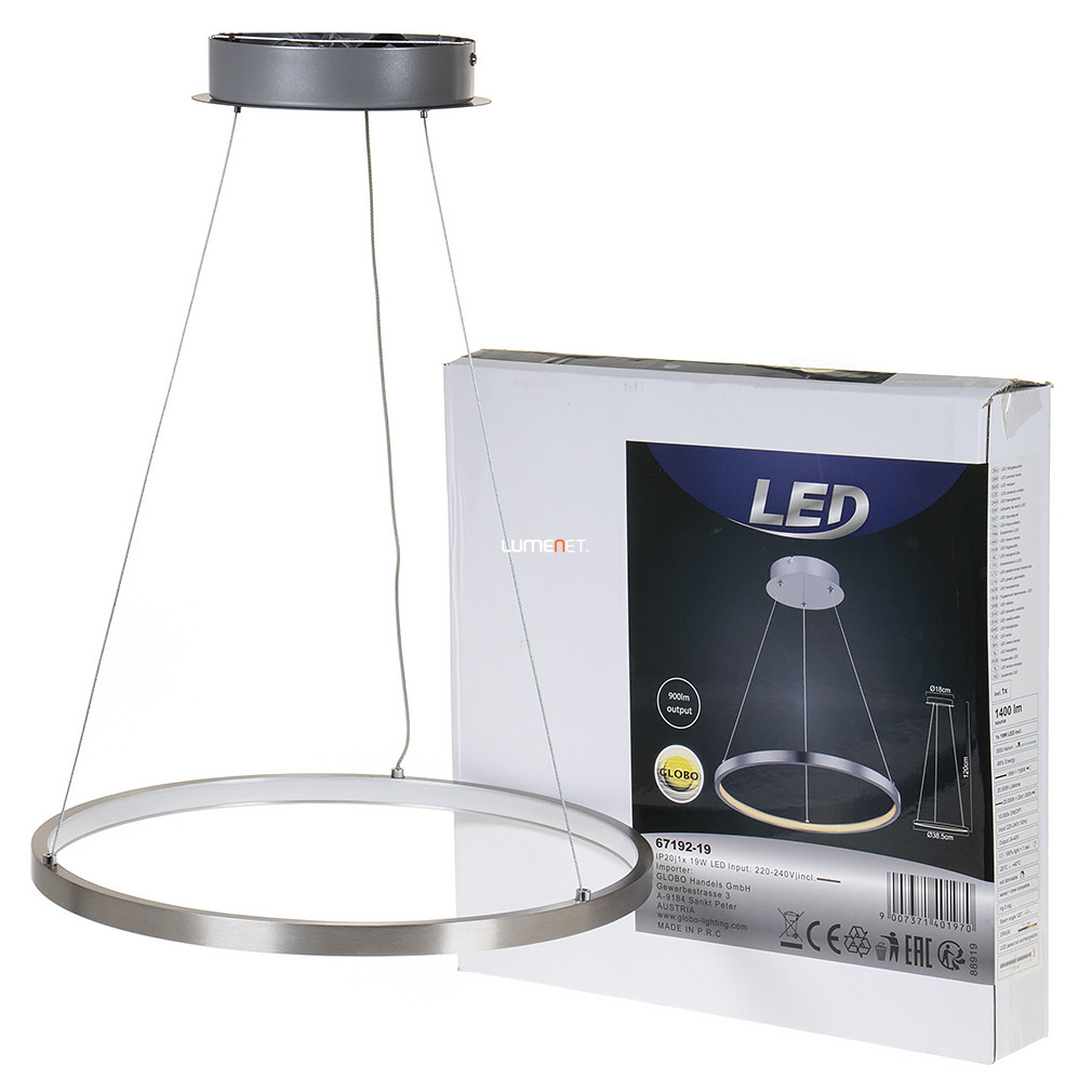 A Minimál függesztett LED lámpa 38,5 cm - Ralph Globo 67192-19 egy modern, letisztult formavilágú világítótest, amelyet főként lakóterek belső megvilágítására terveztek. A lámpatest 19 W teljesítményű, beépített LED modullal működik, amely 900 lumen fényáramot bocsát ki melegfehér, 3000 K színhőmérsékletű fénnyel. A termék nem szabályozható, a LED modul nem cserélhető, átlagos élettartama eléri a 20 000 órát. A lámpa átmérője 38,5 cm, maximális belógása 120 cm, így ideális lehet étkezőasztal vagy nappali központi világításának kialakításához. A lámpatest fő anyagai a fém és a műanyag, felülete nikkel színű, az opál burának köszönhetően egyenletes, vakításmentes fényt biztosít. A termék IP20 védettséggel rendelkezik, ezért kizárólag beltéri használatra alkalmas. A csomagolás méretei: 42 cm hosszú, 41 cm magas, 7 cm széles, tömege 1,15 kg. A lámpa gyártója a Globo.