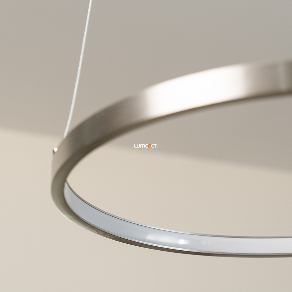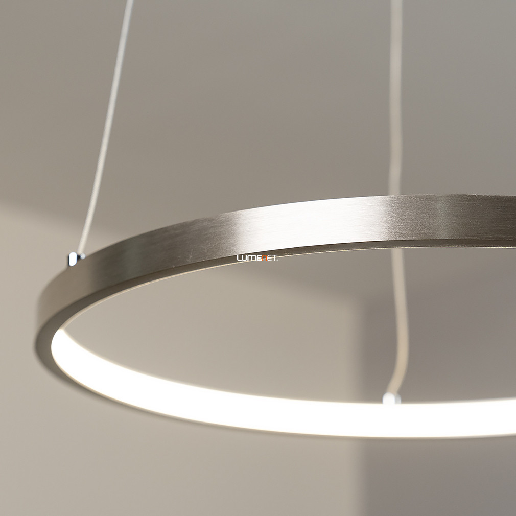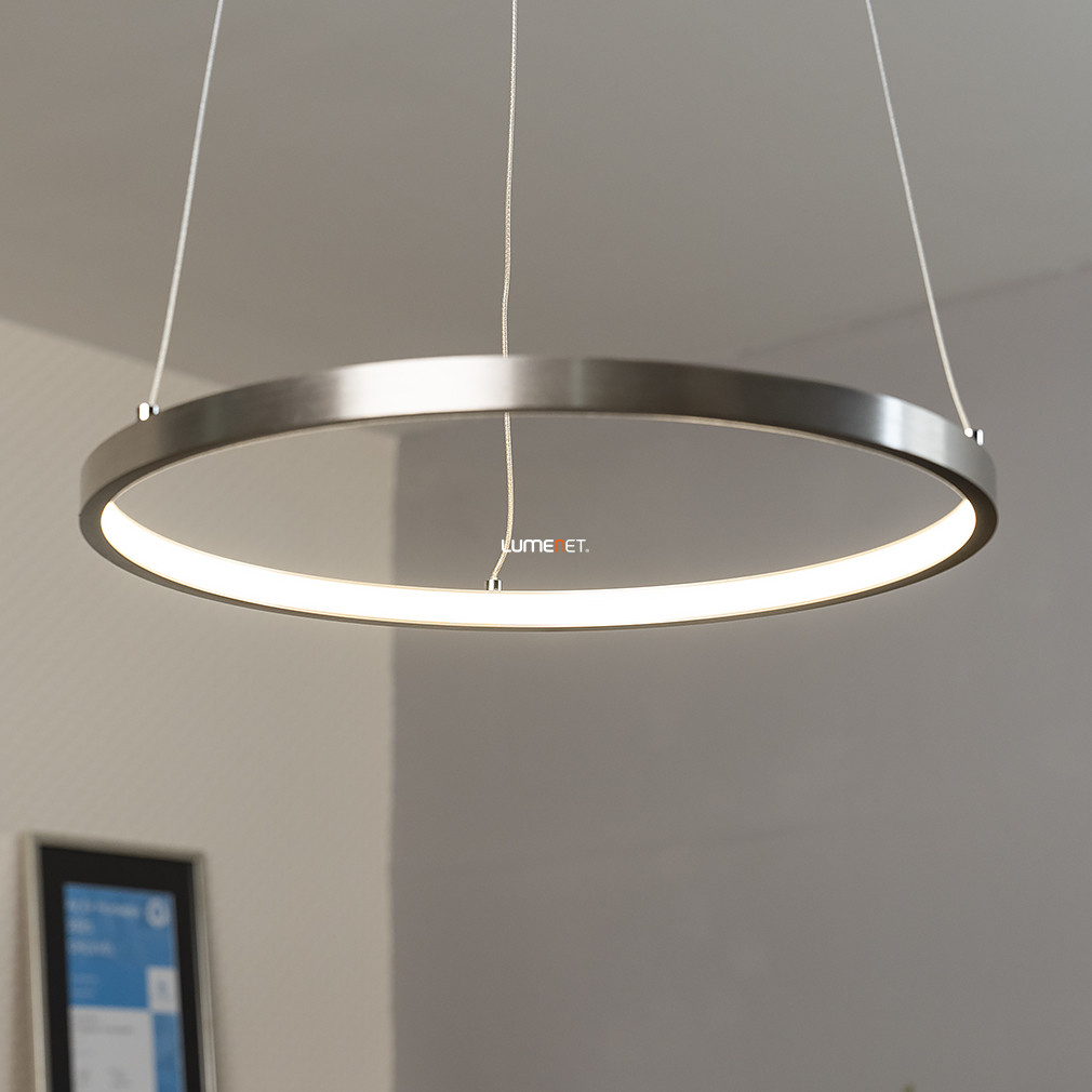 A Minimál függesztett LED lámpa 38,5 cm - Ralph Globo 67192-19 egy modern, letisztult formavilágú világítótest, amelyet főként lakóterek belső megvilágítására terveztek. A lámpatest 19 W teljesítményű, beépített LED modullal működik, amely 900 lumen fényáramot bocsát ki melegfehér, 3000 K színhőmérsékletű fénnyel. A termék nem szabályozható, a LED modul nem cserélhető, átlagos élettartama eléri a 20 000 órát. A lámpa átmérője 38,5 cm, maximális belógása 120 cm, így ideális lehet étkezőasztal vagy nappali központi világításának kialakításához. A lámpatest fő anyagai a fém és a műanyag, felülete nikkel színű, az opál burának köszönhetően egyenletes, vakításmentes fényt biztosít. A termék IP20 védettséggel rendelkezik, ezért kizárólag beltéri használatra alkalmas. A csomagolás méretei: 42 cm hosszú, 41 cm magas, 7 cm széles, tömege 1,15 kg. A lámpa gyártója a Globo.