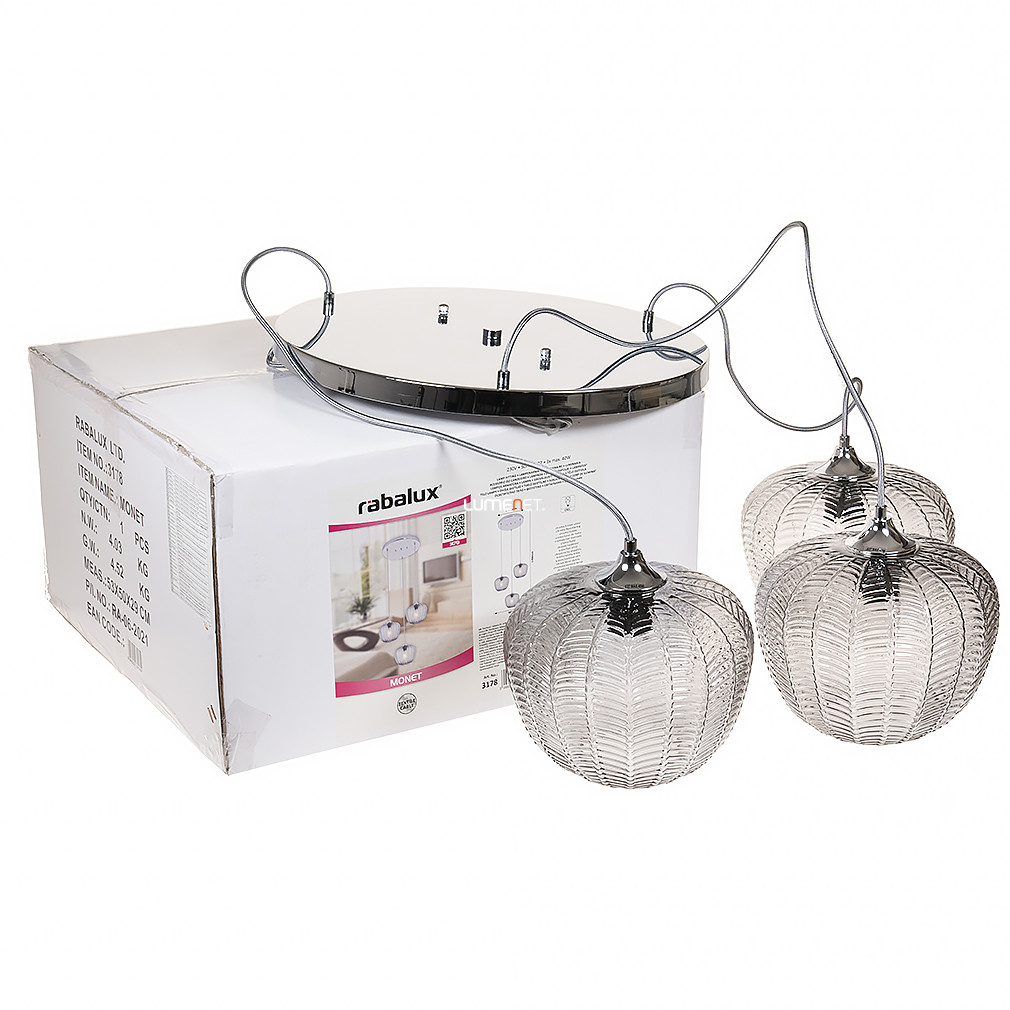 A Monet Rábalux 3178 mintázott függesztett lámpa három E27-es foglalattal rendelkezik, így összesen három cserélhető fényforrás elhelyezésére alkalmas. A lámpatest modern stílusú, króm és füstszínű színkombinációval, amely elegánsan illeszkedik a kortárs enteriőrökbe. A lámpa anyaga fém és üveg, amely biztosítja a tartósságot és az esztétikus megjelenést. A termék teljes hossza 585 mm, szélessége 545 mm, magassága pedig 1700 mm, így nagyobb terekben is jól érvényesül. A lámpatest IP20 védettségi besorolással rendelkezik, ezért beltéri használatra ajánlott. A fényforrás nem tartozék, így a fényáram, színhőmérséklet és teljesítmény a választott izzóktól függ. A lámpa nem szabályozható, logisztikai kódja 3178, tömege 4,52 kg. A gyártó a Rábalux.