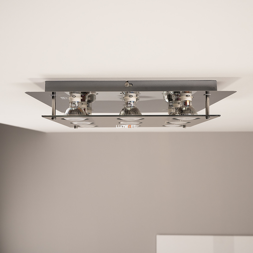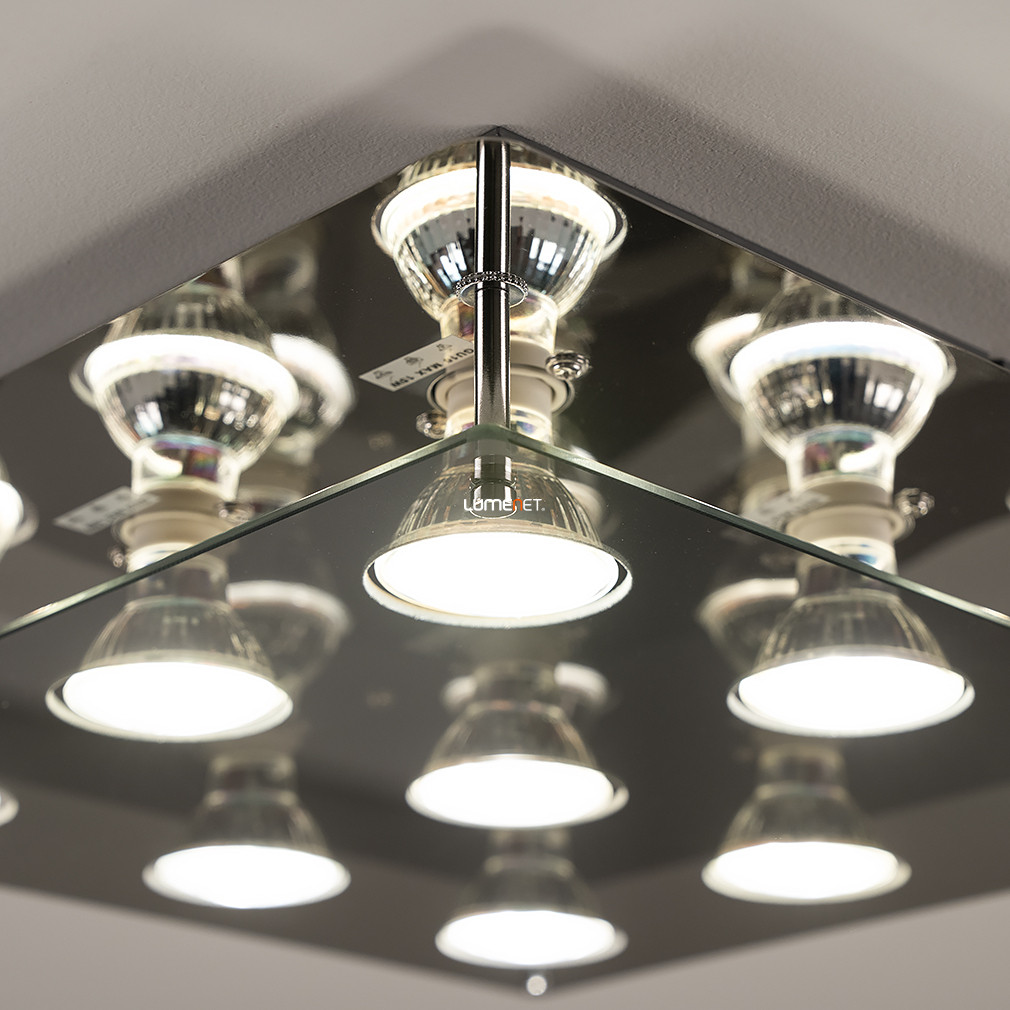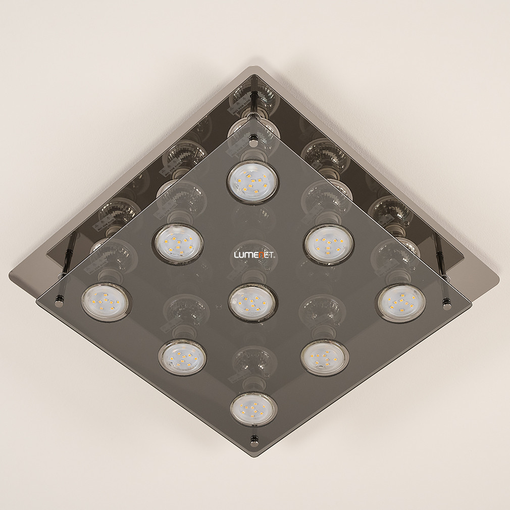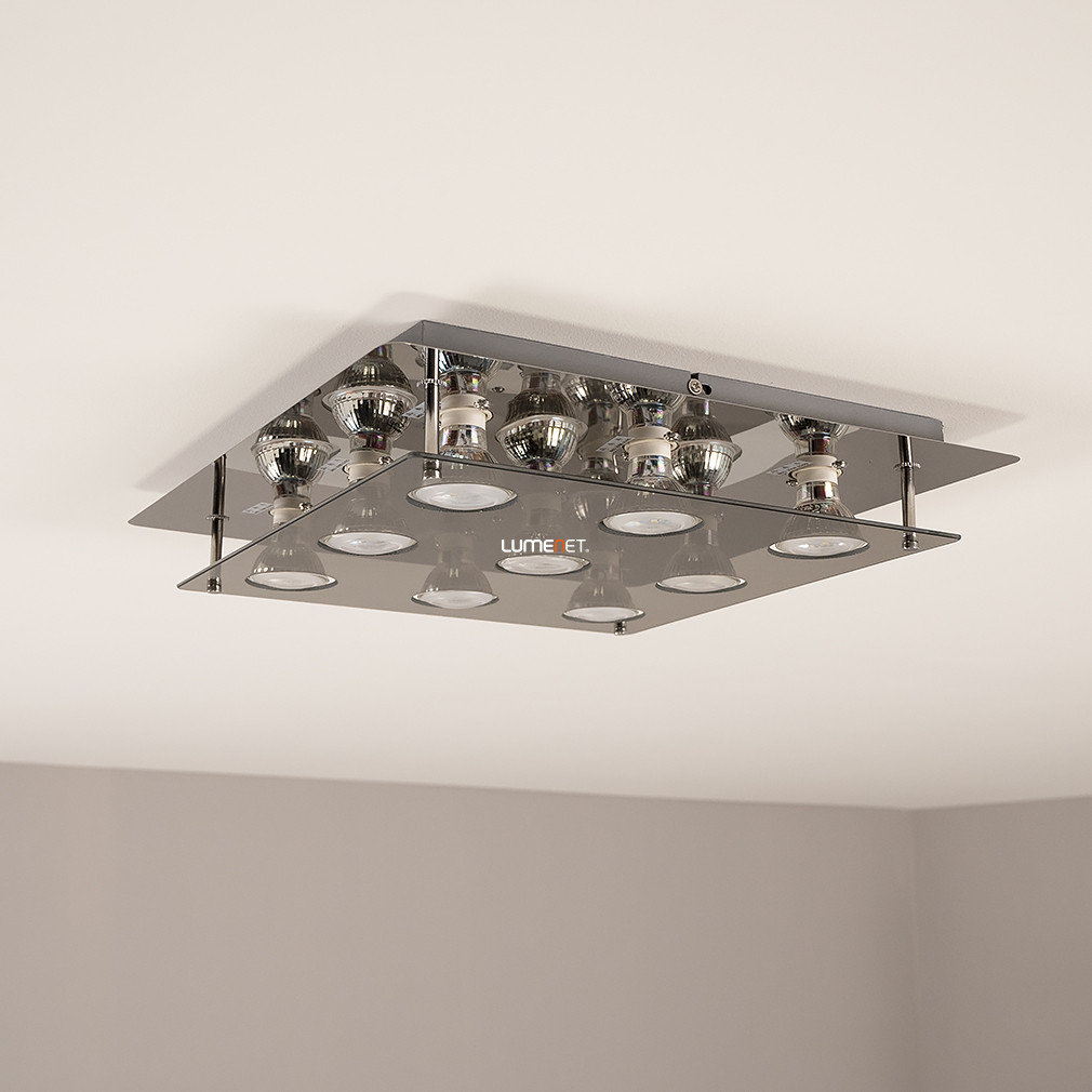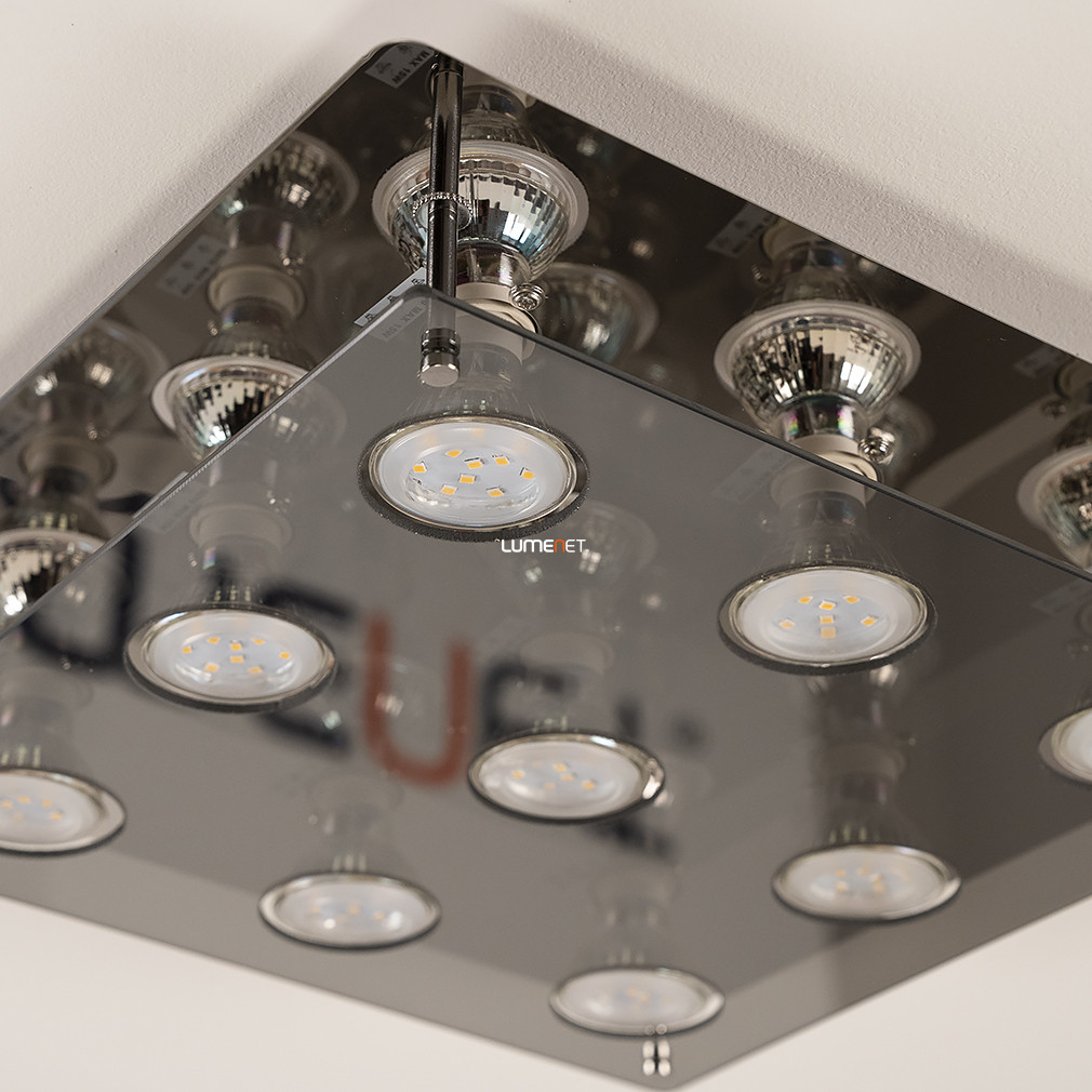 A Naomi Rábalux 2643 modern mennyezeti lámpa kilenc darab GU10 foglalattal rendelkezik, amelyek mindegyike cserélhető LED fényforrással működtethető. A lámpatest kiváló minőségű fém és üveg anyagokból készült, füstszínű és króm felülettel, amely a modern enteriőrök stílusához illeszkedik. A termék mennyezetre szerelhető kivitelben készül, 380 mm hosszúságú és szélességű, tömege 2,88 kg. A lámpa IP20 védettséggel rendelkezik, ezért beltéri használatra alkalmas. A szett tartalmazza a fényforrásokat, amelyek színhőmérséklete, fényárama és teljesítménye cserélhető fényforrás révén igény szerint választható, azonban a lámpa nem szabályozható. A termék csomagolási méretei: 38 cm hosszúság, 5 cm szélesség és 49 cm magasság.
