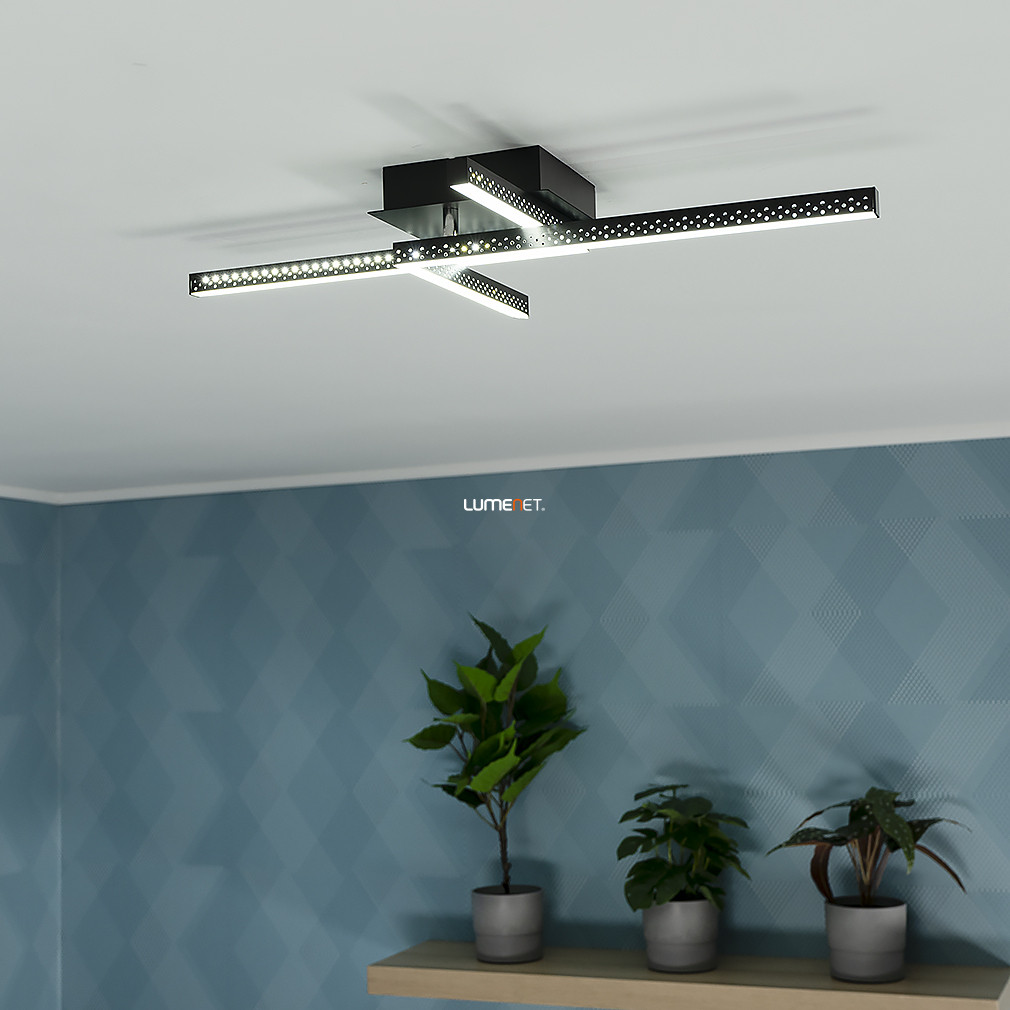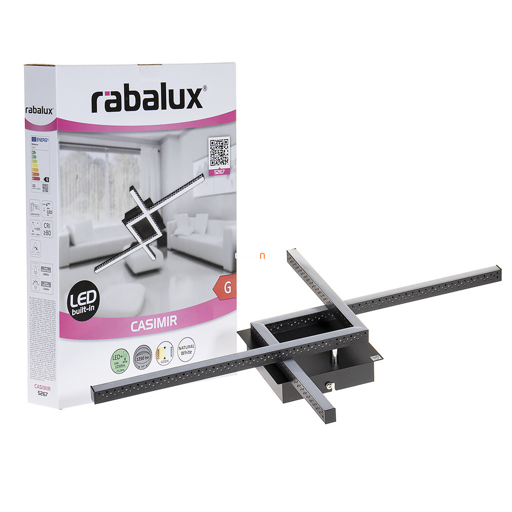 A Casimir Rábalux 5267 modern mennyezeti LED lámpa egy design stílusú, matt fekete és fehér színkombinációval rendelkező lakásvilágítási megoldás, amely fém és műanyag anyaghasználattal készült. A beépített 23 W teljesítményű LED modul 1250 lumen fényáramot biztosít, hidegfehér (4000 K) színhőmérséklettel, így kiválóan alkalmas általános világítási feladatokra. A lámpatest átlagos élettartama 20 000 óra, IP20-as védettsége beltéri használatra teszi alkalmassá. A termék hossza 625 mm, szélessége 385 mm, magassága 75 mm, a csomagolási méretek pedig 32 x 6 x 43 cm. A LED fényforrás a lámpatestben található, cserélhető izzó nélkül.