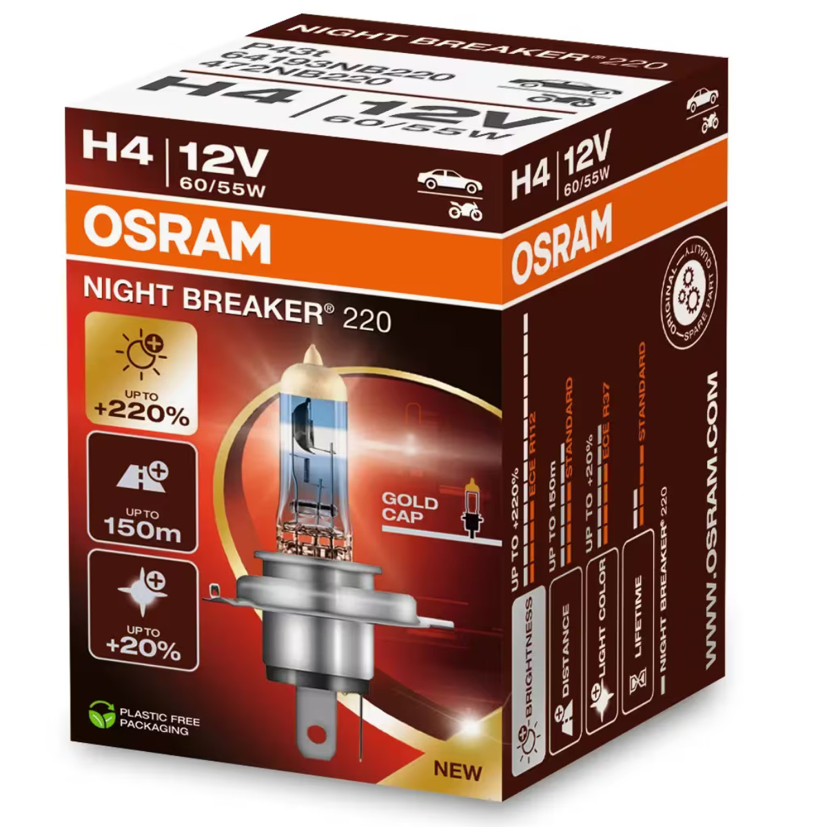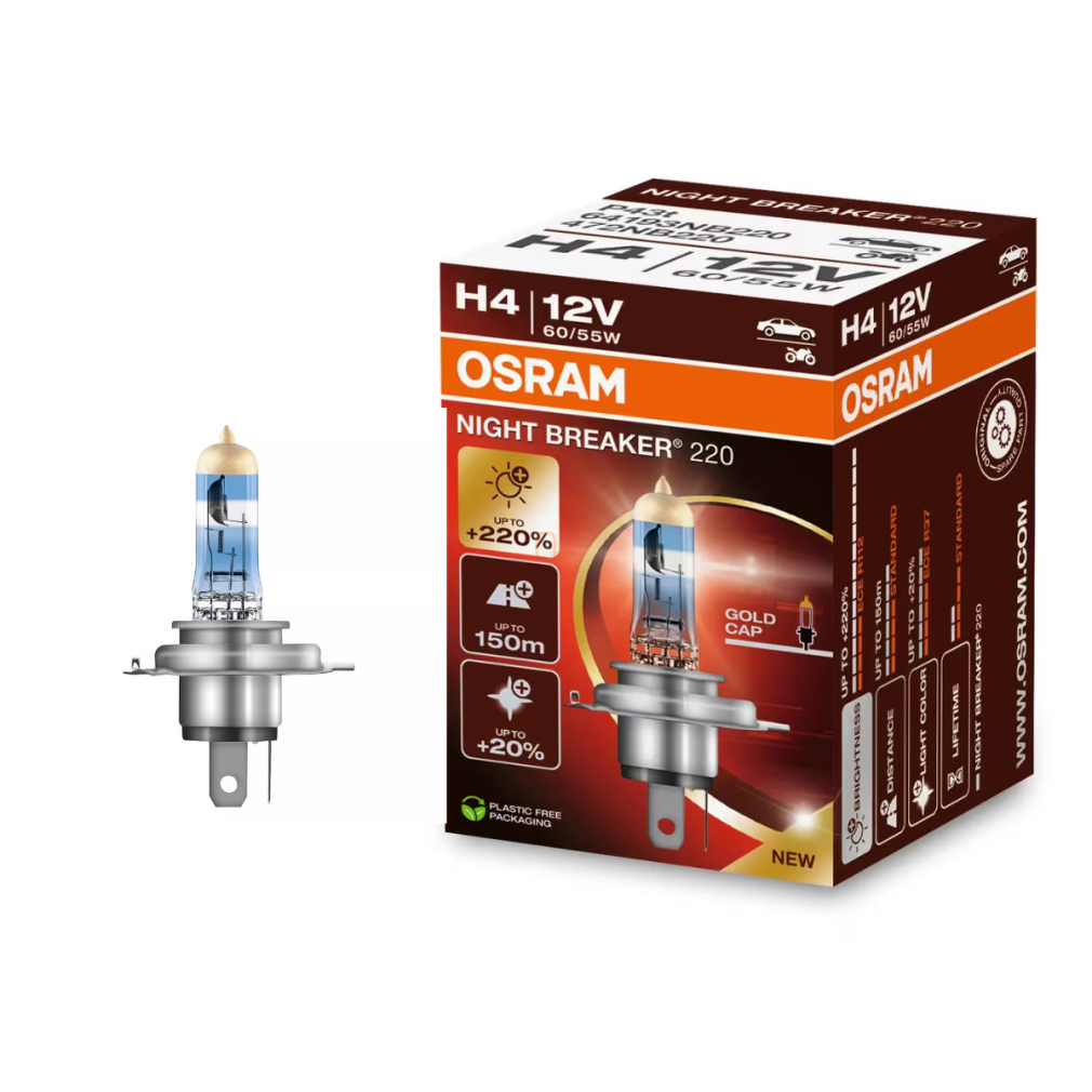 Az Osram Night Breaker 220 H4, 64193NB220 cikkszámú autólámpa az Osram eddigi legerősebb halogén fényszórólámpája, amely új szintre emeli az éjszakai közlekedés biztonságát és komfortját. Ez a prémium kategóriás H4 típusú halogénizzó akár 220%-kal több fényt bocsát ki a minimális ECE R112 szabványhoz képest, így lehetővé teszi, hogy már jóval korábban észrevedd az utadba kerülő akadályokat, gyalogosokat vagy közlekedési táblákat. Az akár 150 méter hosszú fénykéve nemcsak jobb látási viszonyokat biztosít, de lehetőséget ad a gyorsabb és biztonságosabb reakcióra is, különösen sötétben vagy esős időben. A 20%-kal fehérebb, 3200 kelvines fény nemcsak természetesebb, hanem kevésbé fárasztja a szemet, így hosszabb utak során is kényelmesebbé teszi a vezetést. A 1650 és 1000 lumenes fényáram, valamint a ±12% és ±15% fényáram-tűrés biztosítja a kiváló fényeloszlást és megbízható teljesítményt. Az izzó H4-es ECE kategóriába tartozik, P43t foglalattal, 12 V névleges feszültséggel és 60/55 W névleges teljesítménnyel működik. A 64193NB220 élettartama jellemzően 160 és 400 óra között mozog, így az extra fényerő nem megy a tartósság rovására. Az Osram több mint egy évszázada fejleszt világítástechnikai megoldásokat, és innovációival világszerte meghatározó szereplő a járművilágítás területén. Az új Night Breaker 220 modell nemcsak teljesítményével tűnik ki, hanem modern, aranyszínű kupakjával is, amely stílusos megjelenést ad a fényszórónak, különösen a reflektorral kombinált lámpatestek esetében. Ez az izzó hivatalosan használható közúti forgalomban, teljes mértékben megfelel az ECE előírásoknak. Ajánlott minden olyan járműhöz, amely H4-es izzóval szerelt, különösen azok számára, akik gyakran vezetnek éjszaka, vidéki utakon, gyenge közvilágítással rendelkező területeken, vagy egyszerűen csak nagyobb láthatóságot szeretnének. A 64193NB220 kiváló választás lehet például futárok, mentők, taxi szolgáltatók vagy hosszabb távokat vezető sofőrök számára, akiknek a gyors reakcióidő és a vezetési kényelem elengedhetetlen. Ha számodra is fontos, hogy jobban láss, és jobban látható legyél, az Osram Night Breaker 220 H4 a lehető legjobb döntés – teljesítmény, dizájn és megbízhatóság egyetlen kompakt izzóban.