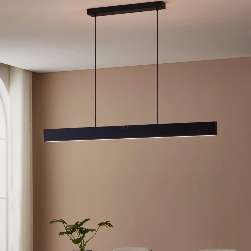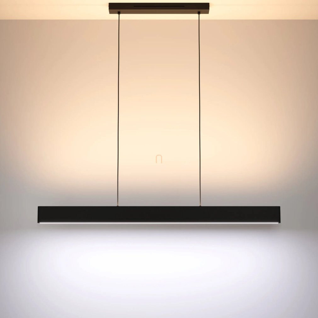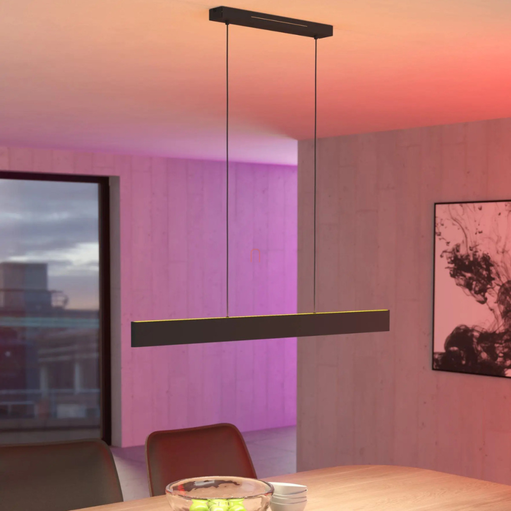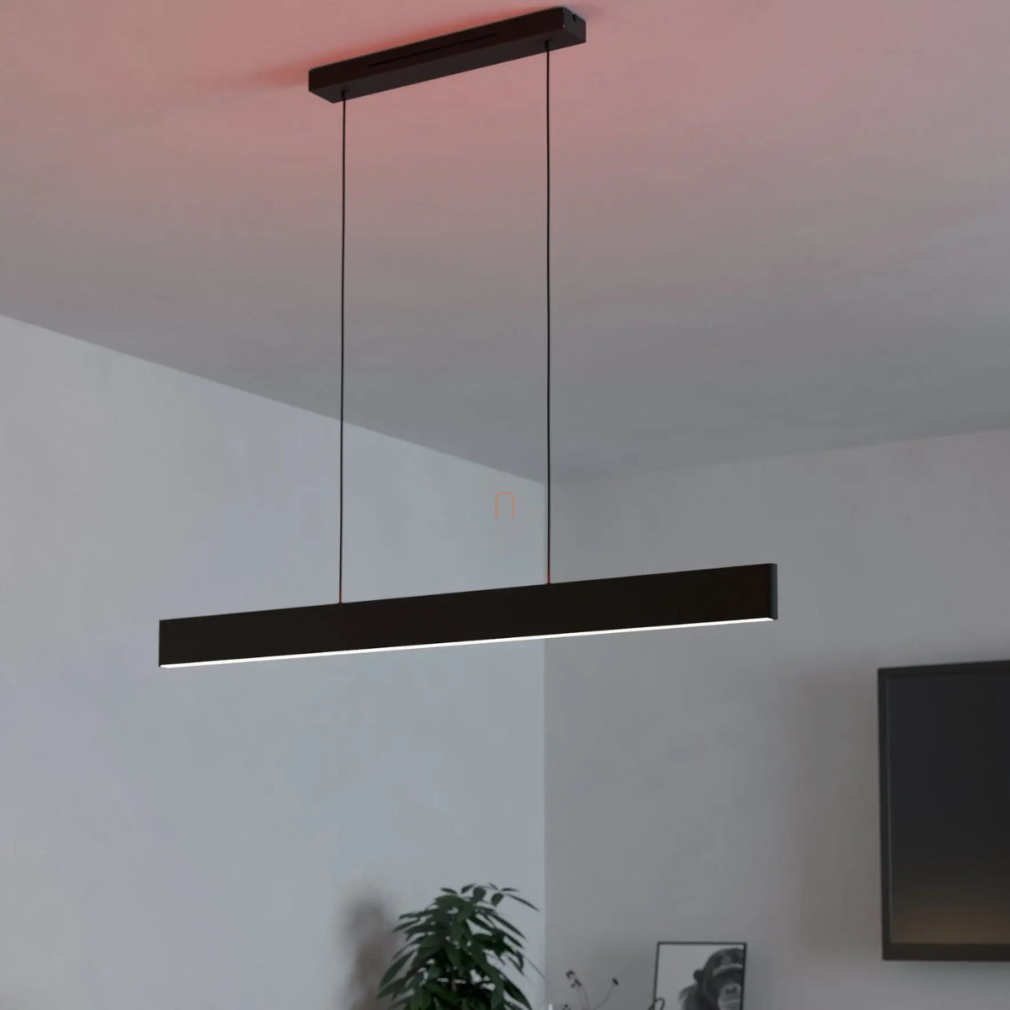 Az Okos függesztett LED lámpa Andreas-Z-RGBW Eglo 900878 egy modern világítási megoldás, amely 38 W teljesítményű LED modullal működik, és 4600 lumen fényáramot biztosít. A lámpa fényének színhőmérséklete 2700 és 6500 Kelvin között változtatható, továbbá RGB színmódot is kínál, így a fehér fény mellett számos színes világítási lehetőséget is nyújt. A fényerő és a színek applikáción keresztül vagy távirányítóval szabályozhatók. A lámpatest fekete és fehér színű acél és műanyag kombinációjából készült, és IP20 védettséggel rendelkezik. A termék méretei: hossza 1170 mm, szélessége 70 mm, magassága 1100 mm, tömege pedig 2,09 kg. A csomagolás méretei: 1190 mm hosszú, 110 mm széles és 90 mm magas. A termék LED modult tartalmaz, amely nem cserélhető, és az Eglo márka kínálatában érhető el.