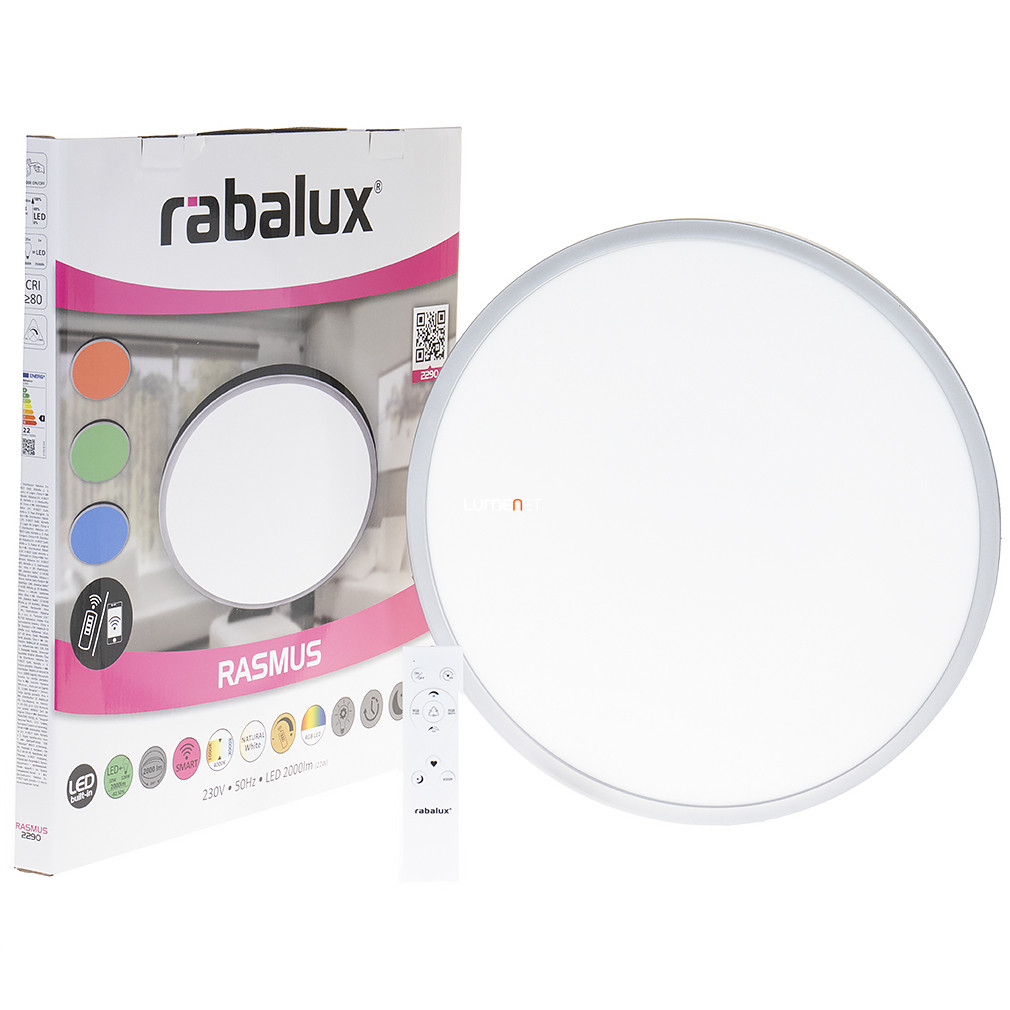 A Rasmus-RGBW Rábalux 2290 okos mennyezeti LED lámpa modern kialakításával és ezüst-fehér színével illeszkedik a kortárs enteriőrökbe. A 22 wattos LED modul 2000 lumen fényáramot biztosít, melynek színhőmérséklete 4000 Kelvin, így hidegfehér megvilágítást nyújt. A lámpa átmérője 415 mm, magassága 30 mm, anyaga műanyag, védettségi szintje IP20. Az eszköz átlagos élettartama 25 000 óra, fényforrása beépített LED modul. Szabályozása applikációval és a tartozék távirányítóval történik, mely lehetővé teszi a fényerő és színváltás mellett a memória, időzítő és éjjeli fény funkciók használatát is.