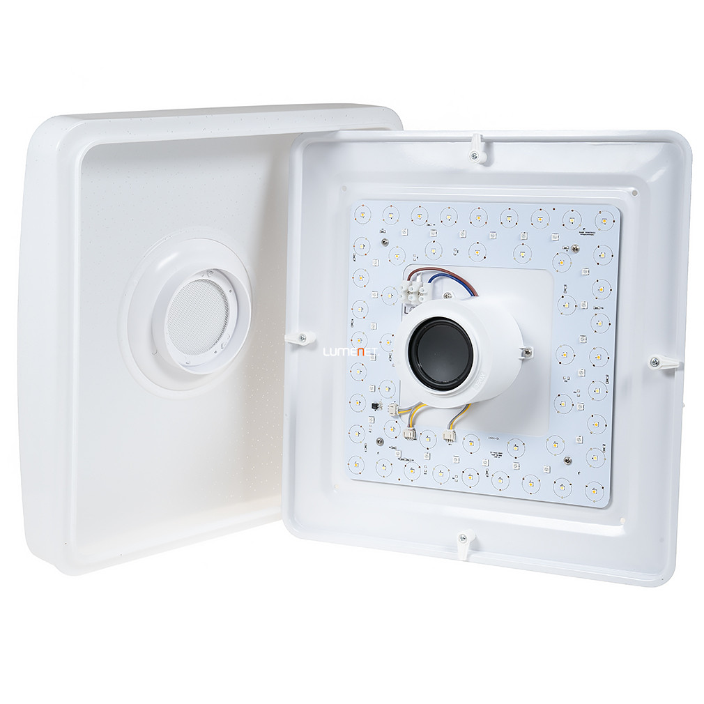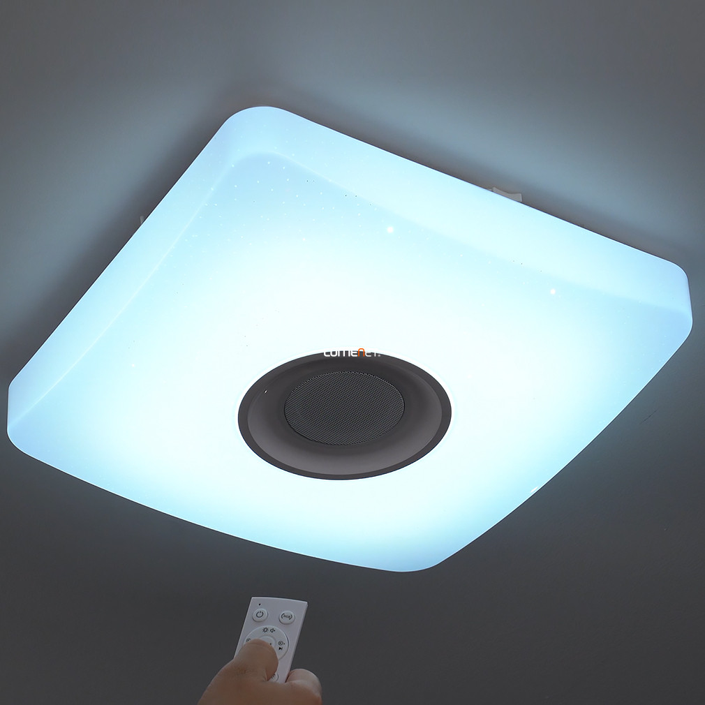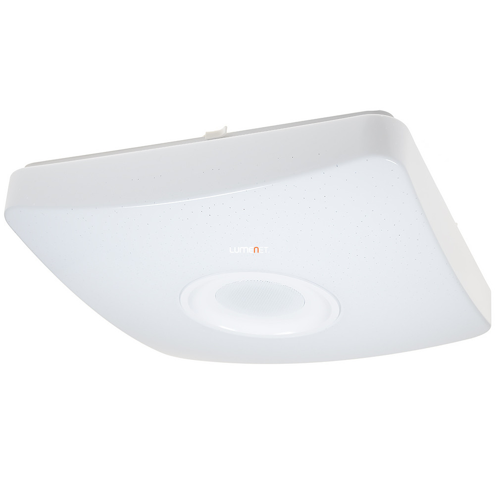 Egy igazán színes egyéniség: a Rábalux 4682 Murry nem pusztán fehéren, de akár színesen is világíthat, hiszen beépített LED modulja RGB-világításra is képes! Emellett a mellékelt távirányító segítségével 3000-6000K között állíthatod a kibocsájtott fehér fény színhőmérsékletét is. Ráadásul rendelkezik beépített hangszórókkal is, így Bluetooth-szal akár zenét is hallgathatsz róla! \n \n Színesen is világíthat \n Állítható színhőmérséklet és fényáram \n 1350 Lumen fényáram \n Beépített hangszóró \n Távirányítóval vezérelhető \n \n Emellett használhatod a beépített időzítőt is, illetve az éjszakai funkciót is. További pozitívum, hogy a modell memóriafunkcióval is rendelkezik, azaz pontosan ugyanazokon a beállításokon kapcsol vissza, ahogyan előzőleg használtad. \n Vadonatúj lámpád ragyogó fényét sokáig élvezheted, hiszen a beépített LED-modulok élettartama 50 ezer óra. LED modulja 18W teljesítményű, fényárama 1350 Lumen. A lámpa mérete 365x365 mm, mennyezettől mért távolsága pedig 90 mm.