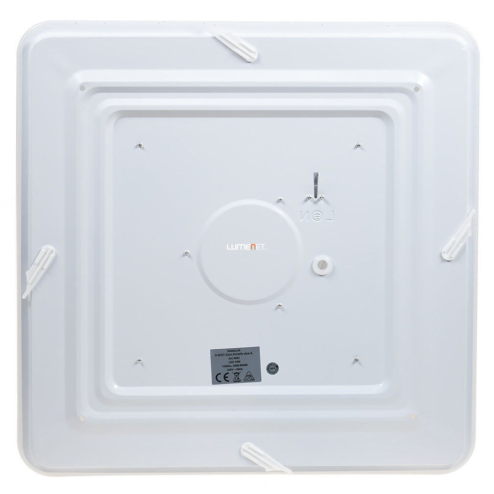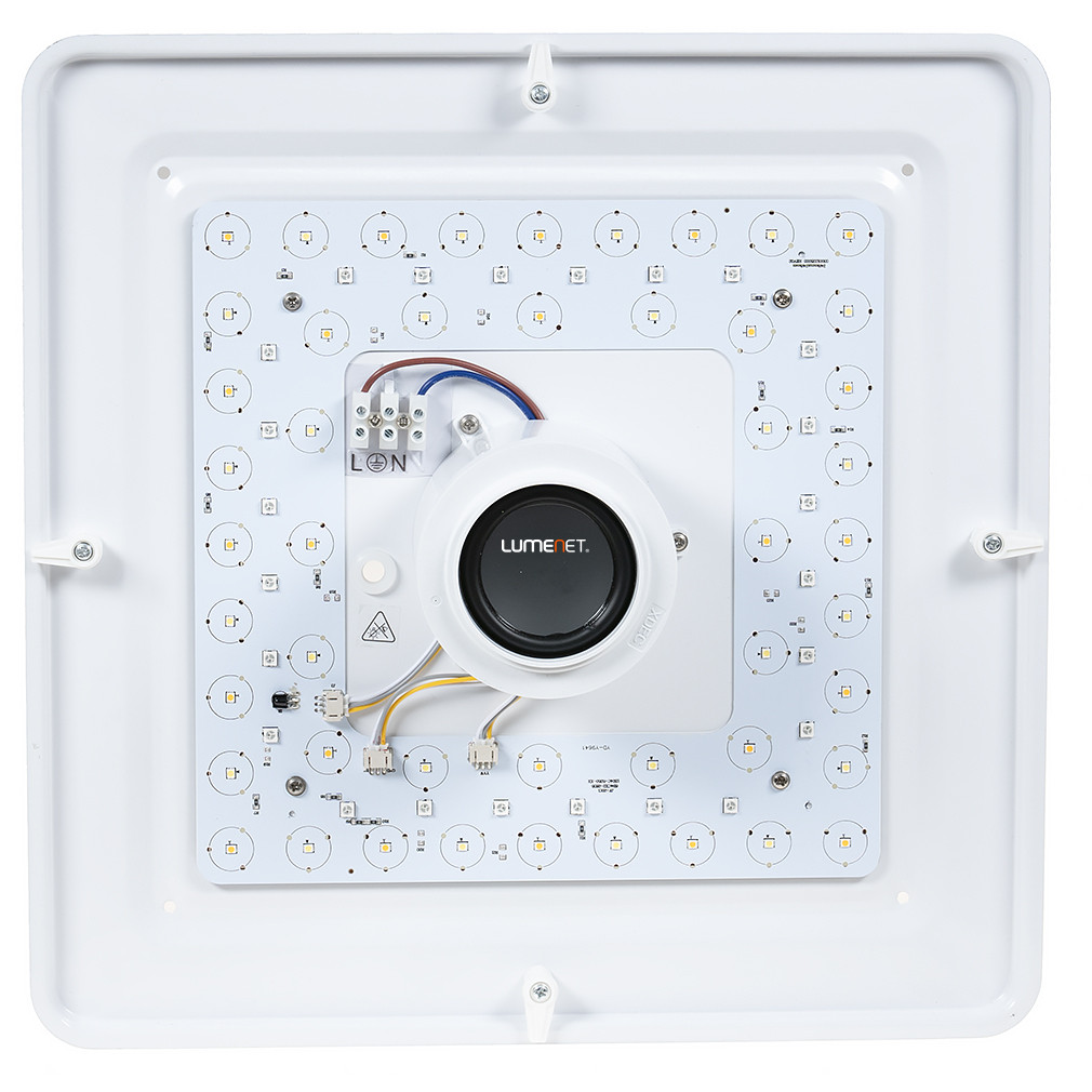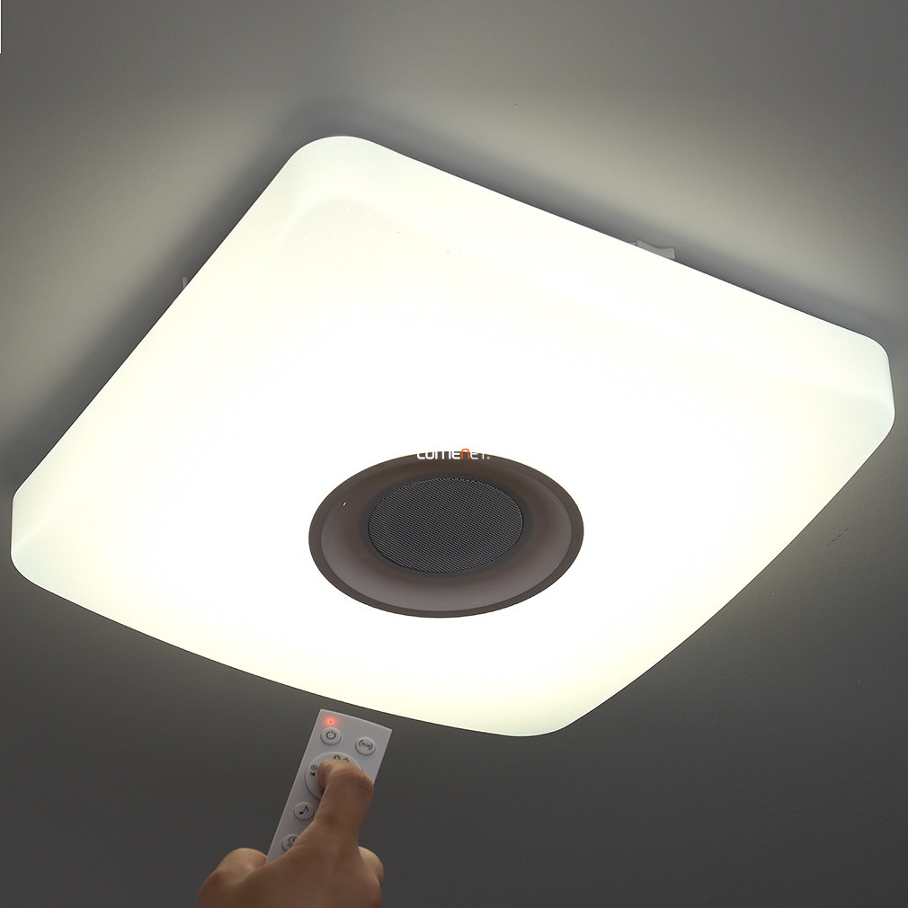 Egy igazán színes egyéniség: a Rábalux 4682 Murry nem pusztán fehéren, de akár színesen is világíthat, hiszen beépített LED modulja RGB-világításra is képes! Emellett a mellékelt távirányító segítségével 3000-6000K között állíthatod a kibocsájtott fehér fény színhőmérsékletét is. Ráadásul rendelkezik beépített hangszórókkal is, így Bluetooth-szal akár zenét is hallgathatsz róla! \n \n Színesen is világíthat \n Állítható színhőmérséklet és fényáram \n 1350 Lumen fényáram \n Beépített hangszóró \n Távirányítóval vezérelhető \n \n Emellett használhatod a beépített időzítőt is, illetve az éjszakai funkciót is. További pozitívum, hogy a modell memóriafunkcióval is rendelkezik, azaz pontosan ugyanazokon a beállításokon kapcsol vissza, ahogyan előzőleg használtad. \n Vadonatúj lámpád ragyogó fényét sokáig élvezheted, hiszen a beépített LED-modulok élettartama 50 ezer óra. LED modulja 18W teljesítményű, fényárama 1350 Lumen. A lámpa mérete 365x365 mm, mennyezettől mért távolsága pedig 90 mm.