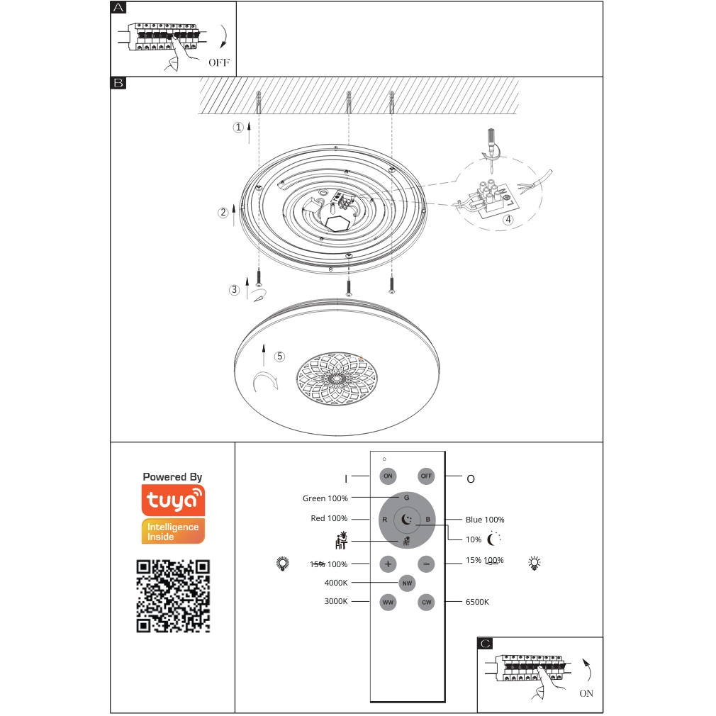 Az Ophelia RGBW Rábalux 5364 okos mennyezeti LED lámpa modern kialakításával és mandala mintás csillámhatású felületével emelkedik ki a lakásvilágítás kategóriában. A 24 W teljesítményű beépített LED modul 2000 lumen fényáramot biztosít, amely változtatható fehér (3000-6500 K) és RGB színű fény kibocsátására képes. A lámpa fényvezérlése történhet Wi-fi kapcsolaton keresztül applikációval vagy a mellékelt távirányítóval, lehetővé téve a színhőmérséklet, fényerő és szín beállítását, valamint a memória-, időzítő- és éjjeli fény funkciók használatát. A lámpatest átmérője 395 mm, magassága 65 mm, IP20 védettségi szinttel rendelkezik, így beltéri használatra alkalmas. A króm és fehér színű, fém és műanyag kombinációjú lámpa átlagos élettartama 25 000 óra. A termék a Rábalux márka modern stílusát képviseli, és a csomagban minden szükséges tartozék megtalálható.