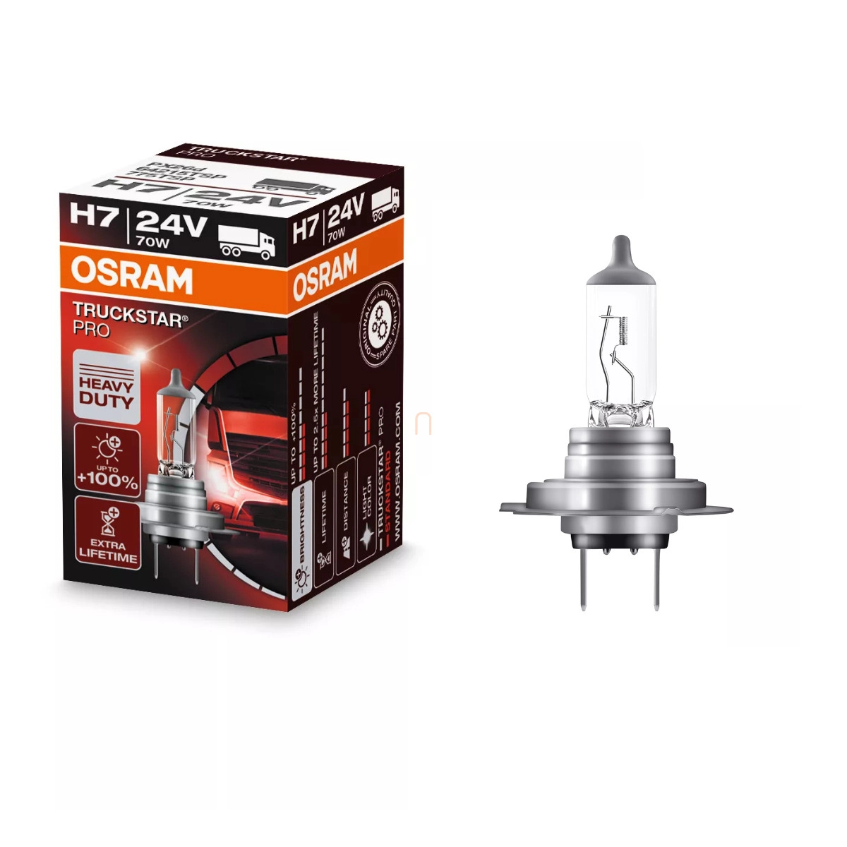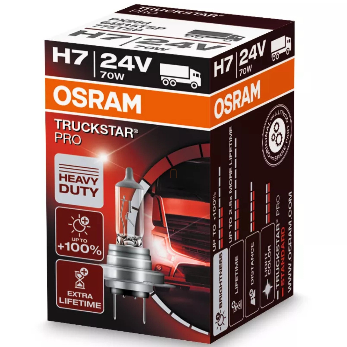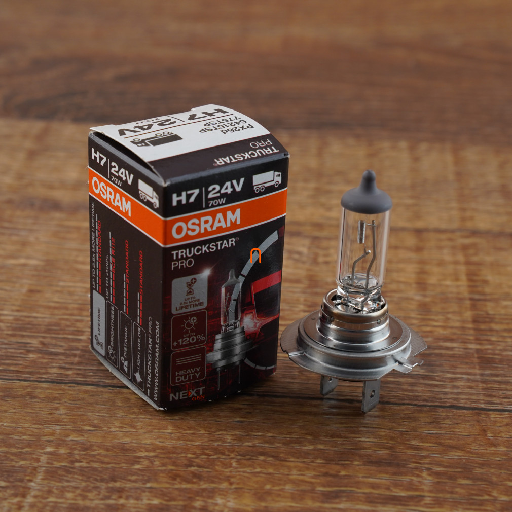 Osram Truckstar Pro H7 teherautó halogén fényszórólámpa, 24V, extra fényerő, hosszú élettartam és rezgésállóság, 64215TSP Az Osram Truckstar Pro H7 halogén fényszórólámpa ideális választás minden teherautó-v, 1db/doboz