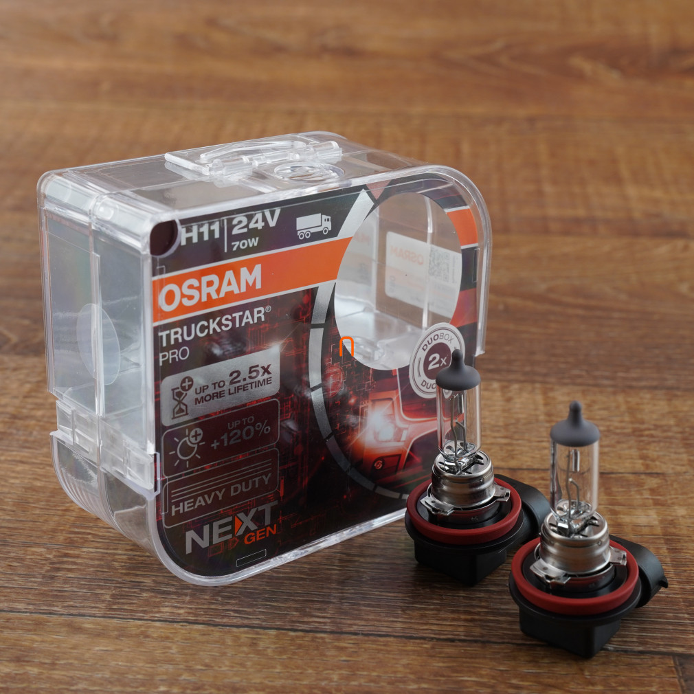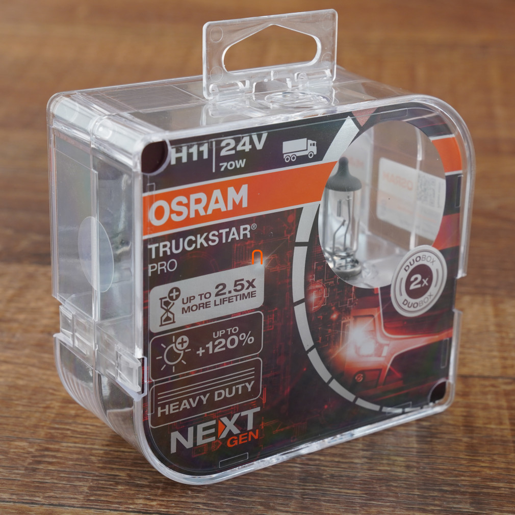 Az Osram Truckstar Pro halogén fényszóróizzó a legfényesebb pont lesz a sötétben. A teherautóknál, kamionoknál, buszoknál jelentkező hosszan tartó terhelés sem okoz gondot. A teherszállításban fennálló tartós, és erős vibrációnak is ellenáll, élettartama kétszer hosszabb, mint a standard 24V halogén fényszóróizzó. A professzionális technikai megoldásnak köszönhetően jelentősen megnő a rendelkezésre állási idő, ami minden esetben a biztonságot növeli. Köszönhetően a technológiai megoldásoknak az Osram Truckstar Pro fényszóróizzók, dupla szervizidővel, és 100%-al magasabb fénykibocsátási jellemzőkkel, magasan első a kategóriájában. Használatát ajánljuk városi, de legfőképpen országúti környezetben ahol a jobb láthatóság, nagyobb biztonságot eredményez. Kétszeres élettartam a standard 24V-os halogénhez képest 100%-al több hasznos fény a megvilágított útfelületen.