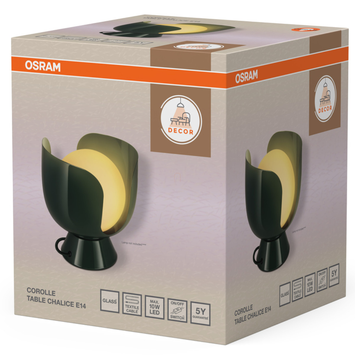 A Decor Corolle egy dekoratív lámpacsalád, amelyet színes fém és üveg anyagok felhasználásával készítenek, cserélhető fényforrással. Ez a modell egy asztali kehelyformájú lámpatest zöld színben.