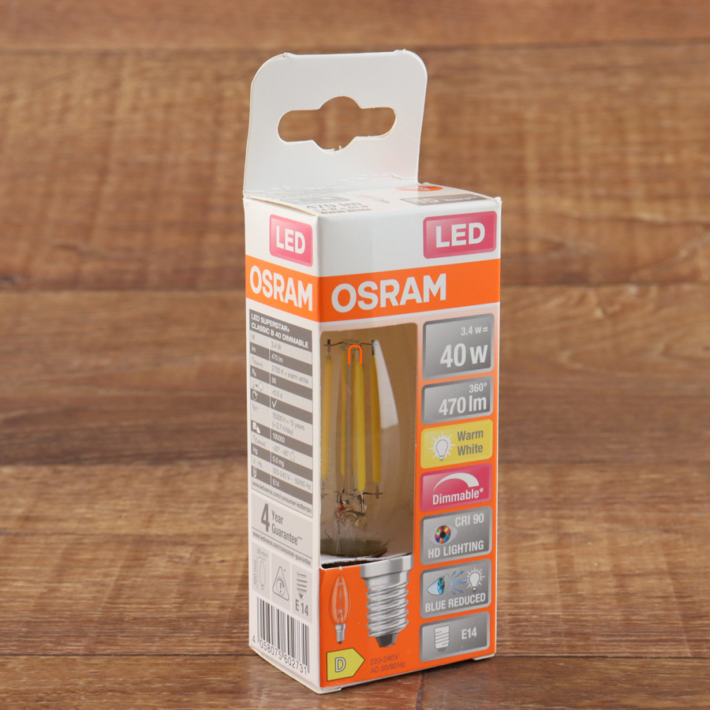 Osram E14 LED SStar+ gyertya 3,4W 470lm 2700K melegfehér, szabályozható 300° víztiszta - 40W izzó helyett