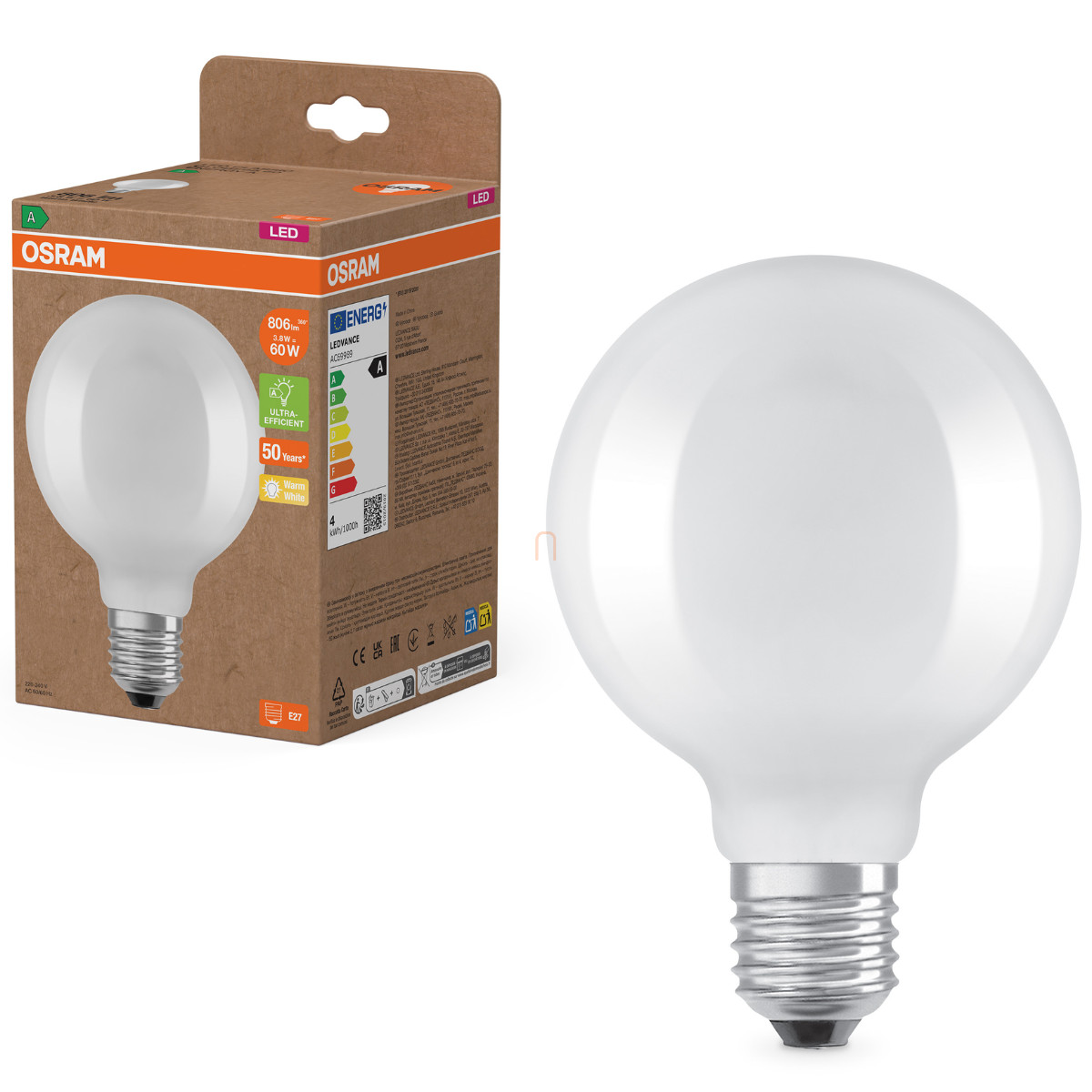 Osram E27 LED nagygömb, 3,8W, 806 lm, 2700 K, melegfehér, opál üveg-60 W izzó helyett - Superstar+ Classic Globe95