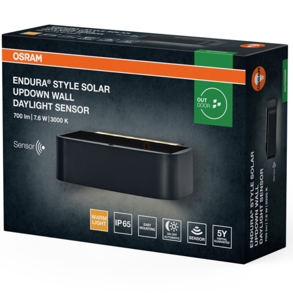 Kültéri napelemes fali LED lámpa, fényérzékelős, le és fel világítós - Osram Endura Sty Sol Updown, 3000 K, 520 lm, IP65, 4,2 V