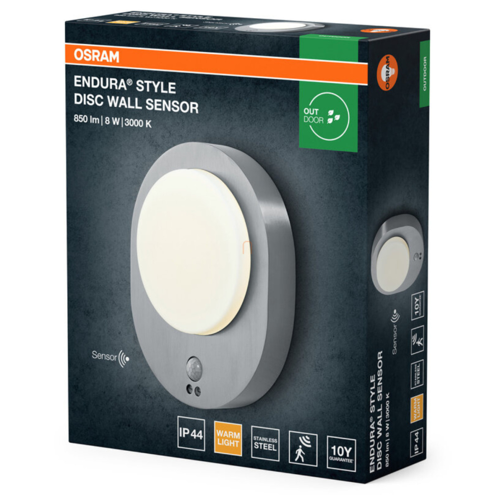Osram kültéri fali LED lámpa fény és mozgásérzékelővel, melegfehér, 8 W (Endura Style Disc)
