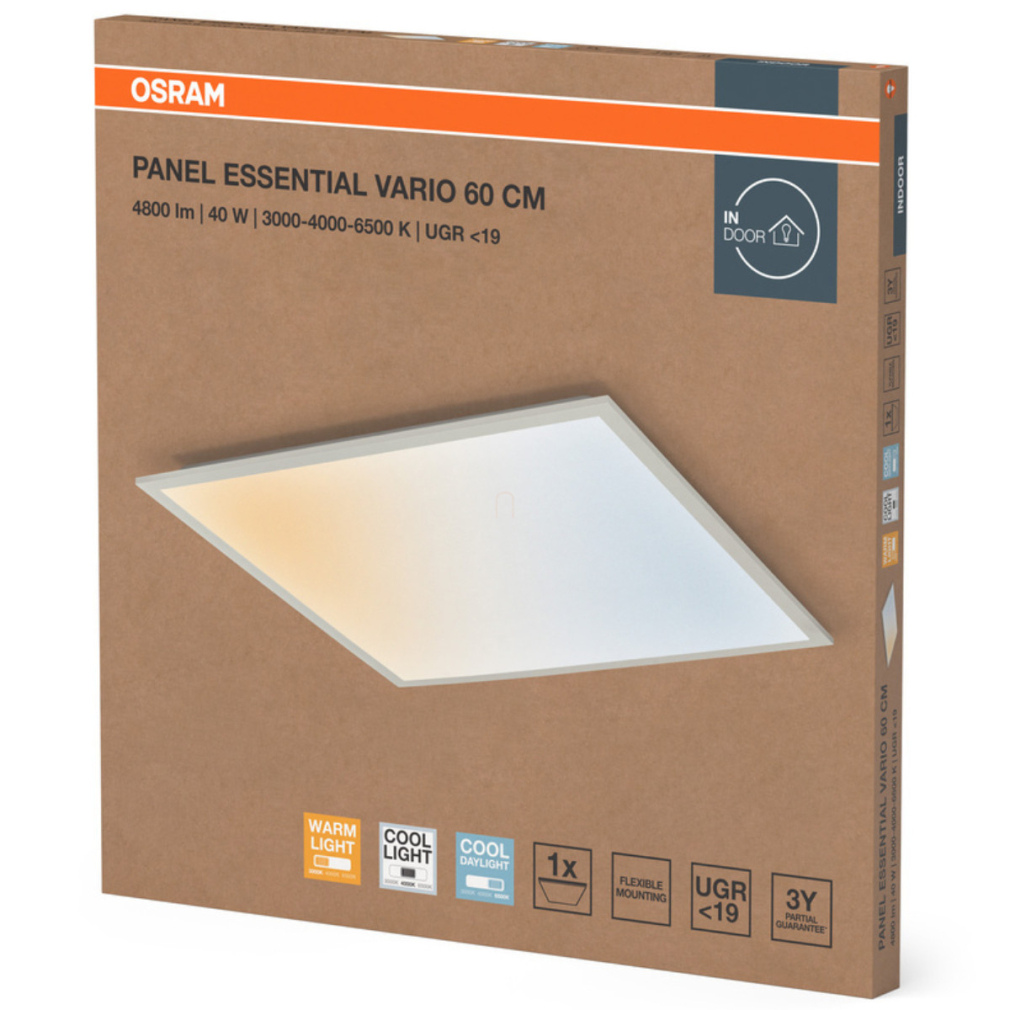 A Ledvance Essential Panel UGR≤19 600x600mm egy LED mennyezeti lámpatest alumínium kerettel. A termék fő előnyei közé tartozik a kiváló káprázáscsökkentés (UGR ≤ 19), a hosszú élettartam (akár 30.000 óra) a LED technológiának köszönhetően, valamint a kiváló ár/teljesítmény arány. Kiemelkedően sokoldalú a meghajtón választható színhőmérséklet (Multi Color) funkciónak köszönhetően. 2 az 1-ben kialakításának köszönhetően süllyesztett szerelésre és felületi szerelésre (kiegészítő készlettel) egyaránt alkalmas. A szerelést a hátlapon található acélhorgok teszik egyszerűvé.