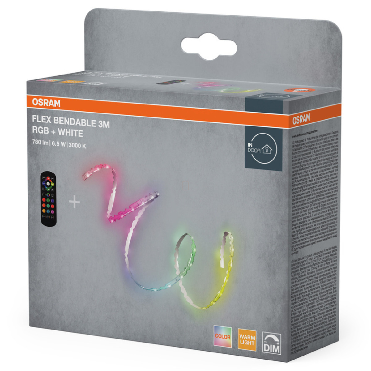 Az Osram Flex Bendable 3M RGB 830 Remote Control különlegessége a mellékelt távirányító, amellyel kényelmesen vezérelheted a világítás színét, fényerejét és működési módjait. A termék dimmelhető, így a fényerőt igény szerint szabályozhatod. A szalag élettartama kiemelkedő: 25°C-os környezeti hőmérsékleten L70/B50 értékkel mérve 30000 óra, és 10000 kapcsolási ciklust bír el. A CR2025 típusú elem, amely a távirányítóhoz szükséges, a csomagolás részét képezi.