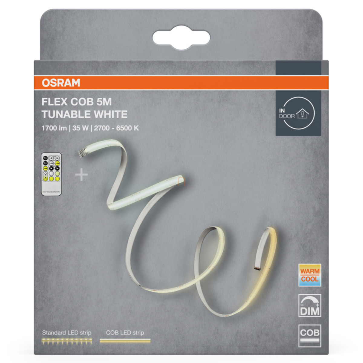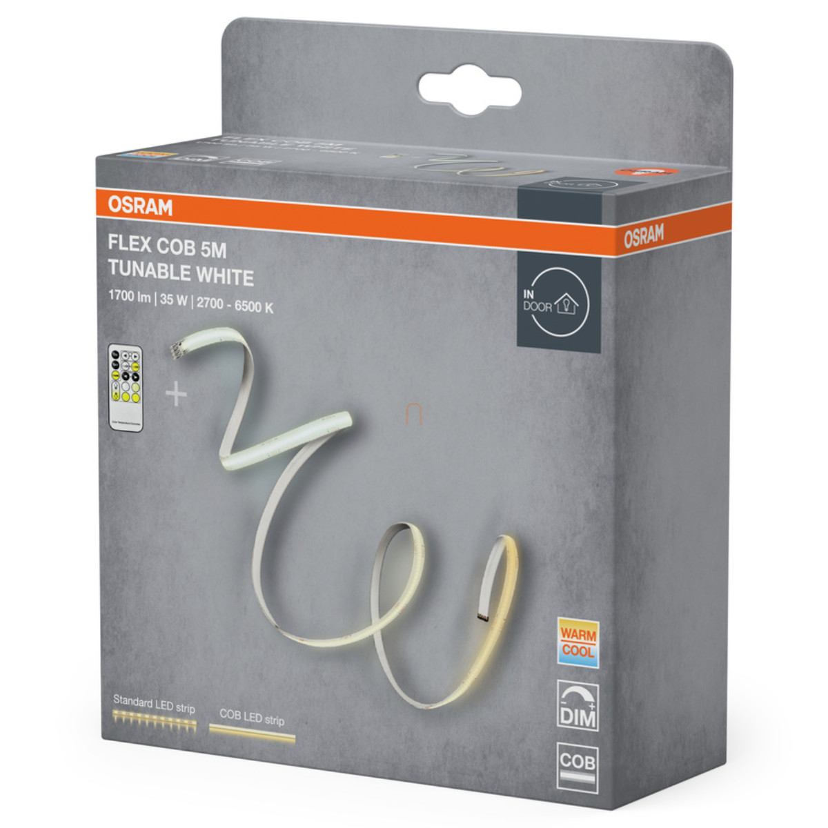 Műszaki szempontból Az Osram Flex COB 5M TW + RC impresszív paraméterekkel rendelkezik. A 35W névleges teljesítménnyel működő LED szalag 1700 lumen fényáramot biztosít, ami 87 lm/W fényhasznosításnak felel meg. Az IP20 védettség beltéri használatra teszi alkalmassá. A termék 170°-os sugárzási szöggel rendelkezik, ami ideális a széles területek egyenletes megvilágítására. A szalag minőségi kivitelezését a legalább 80-as színvisszaadási index (CRI Ra≥80) is jelzi, amely biztosítja, hogy a megvilágított tárgyak színei természetesen jelenjenek meg. A fotobiológiai biztonság szempontjából RG1 besorolással rendelkezik, ami alacsony kockázatot jelent.