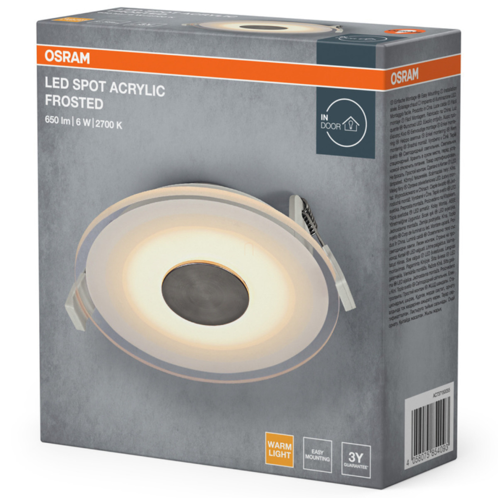 Az Osram LED Spot Acrylic Frosted 6W 827 White egy modern és stílusos süllyesztett mennyezeti LED lámpa, amely tökéletes megoldást nyújt otthonod világítására. Ez az integrált LED-es lámpa frosted (matt) akril burkolattal rendelkezik, amely kellemesen szórt fényt biztosít, és elegáns megjelenést kölcsönöz a helyiségnek. Kifejezetten lakóterek – például nappalik, étkezők és hálószobák – megvilágítására tervezték.