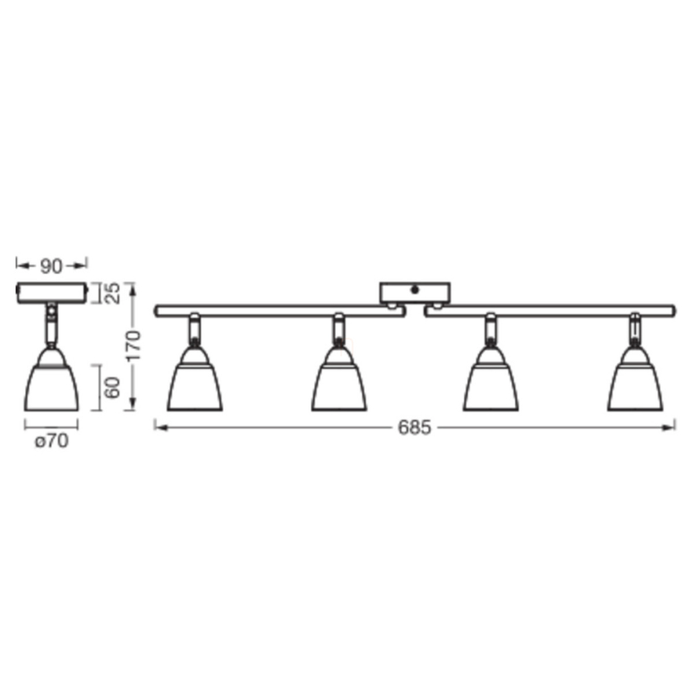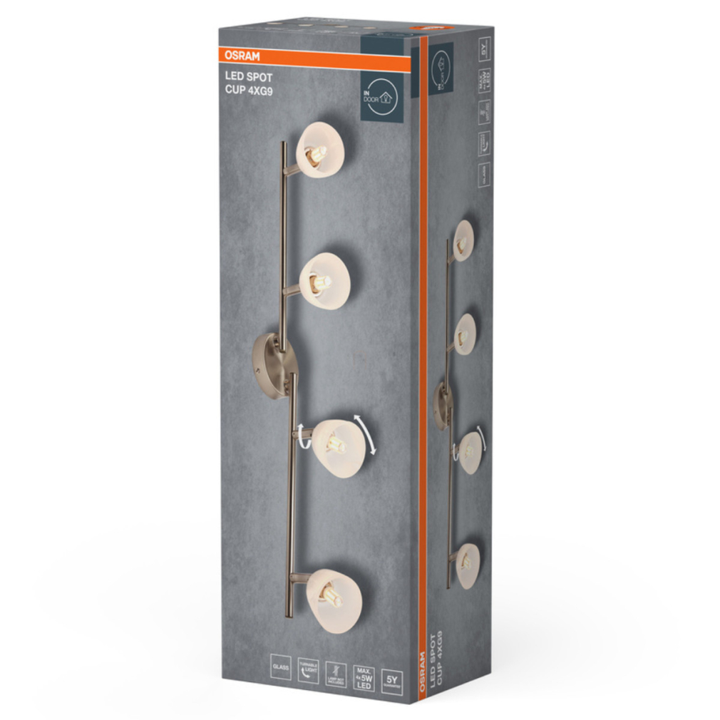 A LED Spot Cup 4xG9 Brushed Nickel egy négy állítható spotfejjel rendelkező mennyezeti lámpatest. Időtálló designja és rugalmas felhasználhatósága révén tökéletes választás otthonok beltéri világításához. A szatén nikkel felületkezelés és az alabástrom üveg búrák harmonikus megjelenést biztosítanak.