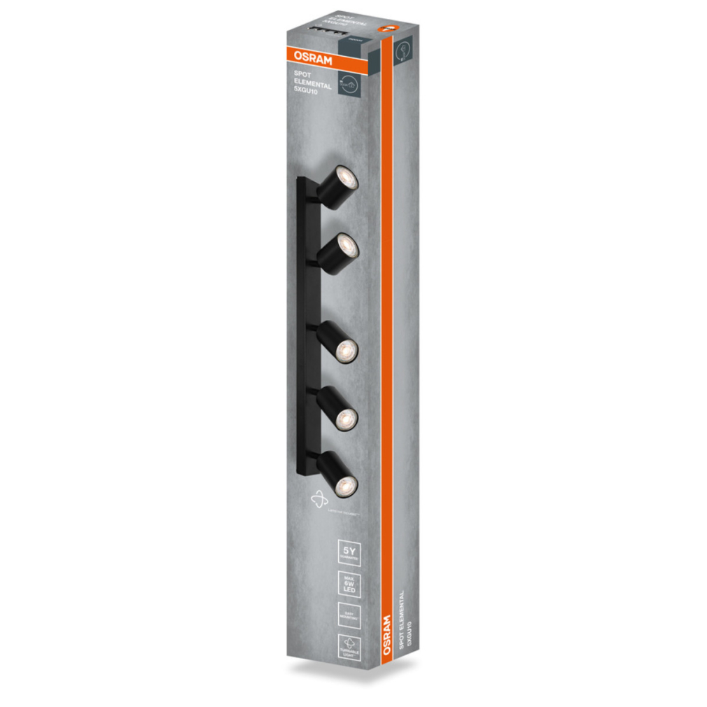 A Ledvance LED Spot Elemental 5XGU10 Black egy fekete színű, mennyezetre vagy falra szerelhető lámpatest 5 darab állítható spotfejjel, amelyek GU10-es foglalattal rendelkeznek. A lámpatest magas minőségű alumínium és acél anyagokból készült, ami tartósságot és elegáns megjelenést biztosít.