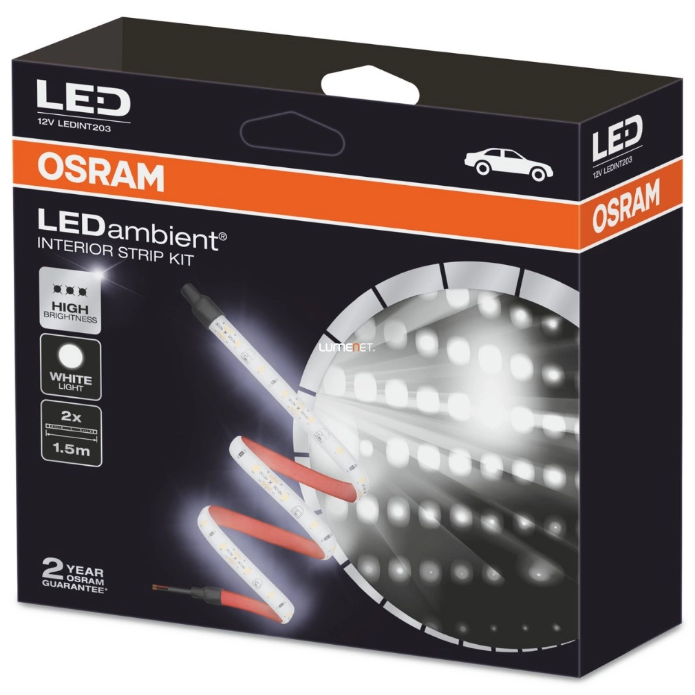 Napjainkban egyre inkább elterjednek az új autókban a különféle LED hangulatfények: amennyiben te is szeretnéd átélni ezt az élmény a mostani kocsidban, itt a lehetőség! Az Osram LEDambient fehér beltéri szalagja rendkívül jól néz ki, ráadásul egyszerűen felszerelhető. A csomag 2 darab, egyenként 1,5 méter hosszú, 90 darab LED-et tartalmazó szalagot tartalmaz. Ezek egyszerűen alakíthatók, így a műszerfal vagy épp az ajtópanelek réseibe könnyedén beilleszthetők.