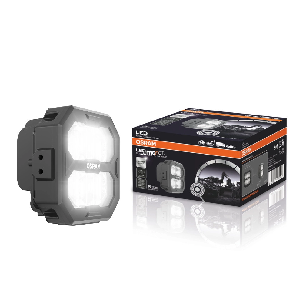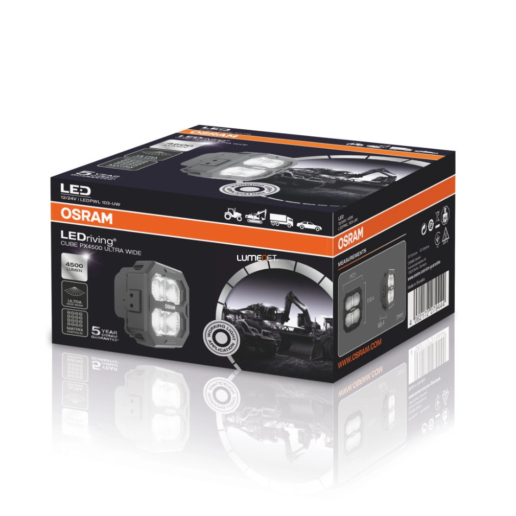Az Osram LEDriving Cube PX 4500 Ultra Wide munkalámpa ideális választás azok számára, akik a legnagyobb fényerőt keresik nehéz körülmények között végzett professzionális munkavégzéshez. Ez az Osram Professional Series PX szériába tartozó LED munkalámpa 4500 lumenes fényárammal világítja meg a legnagyobb munkaterületeket is, miközben a 6000 kelvines, természetes fehér fény biztosítja a maximális kontrasztot és a szemkímélő munkakörnyezetet. A 45 wattos fogyasztás mellett kiemelkedő hatásfokkal működik, amit az Ultra Wide típusú fénynyaláb egészít ki – ez nagy felületet fed le széles szórással, így egyenletes és homogén megvilágítást biztosít. Kompatibilis 12 V-os és 24 V-os járműrendszerekkel, ezért rugalmasan beépíthető mezőgazdasági, építőipari vagy ipari járművekbe és gépekbe. A robusztus alumíniumöntvény ház és a törésálló polikarbonát lencse gondoskodik a hosszú élettartamról és az ellenálló képességről még szélsőséges környezeti feltételek mellett is. A lámpa IP6K8 és IP6K9K minősítéssel rendelkezik, ami azt jelenti, hogy teljes mértékben porálló, vízálló akár nagynyomású mosás esetén is, valamint CISPR25 Class 5 szabványnak megfelelő elektromágneses zavarvédelmet nyújt, így nem zavarja a jármű elektronikai rendszereit. A beépített túlmelegedés- és polaritásvédelem, valamint a DT csatlakozón keresztüli egyszerű csatlakoztatás még kényelmesebbé és biztonságosabbá teszi a használatot. A munkalámpa háromféle módon szerelhető fel: közvetlenül, rugalmas standard vagy nagy teherbírású módon, így alkalmazkodik minden szerelési igényhez. A PX termékcsalád különböző teljesítményszinteket kínál, és lehetőséget biztosít egyedi, járműspecifikus világítási konfigurációk kialakítására, amelyek tökéletesen igazodnak az adott felhasználási környezethez. Fontos tudni, hogy ez a típus nem használható közúti forgalomban, kizárólag munkaterületeken vagy speciális körülmények között engedélyezett. Ez a modell azok számára ajánlott, akiknél a maximális fényerő és a széles fényeloszlás kiemelten fontos szempont, például nagy építkezési területeken, éjszakai földmunkáknál vagy mezőgazdasági szezonális munkák során. Az Osram több mint 100 éves tapasztalatát és innovációját testesíti meg ez a prémium LED munkalámpa, amelyben a német precizitás, a megbízhatóság és a világítástechnikai szakértelem találkozik. A vállalat története 1919-ben kezdődött, és azóta vezető szerepet tölt be a világítástechnika területén, legyen szó az első halogén izzók bevezetéséről vagy a LED-technológia ipari forradalmáról. Az Osram elkötelezettsége a minőség és a biztonság iránt most a PX 4500 Ultra Wide modellben ölt testet, amely méltó társa lehet a professzionális felhasználóknak nap mint nap.