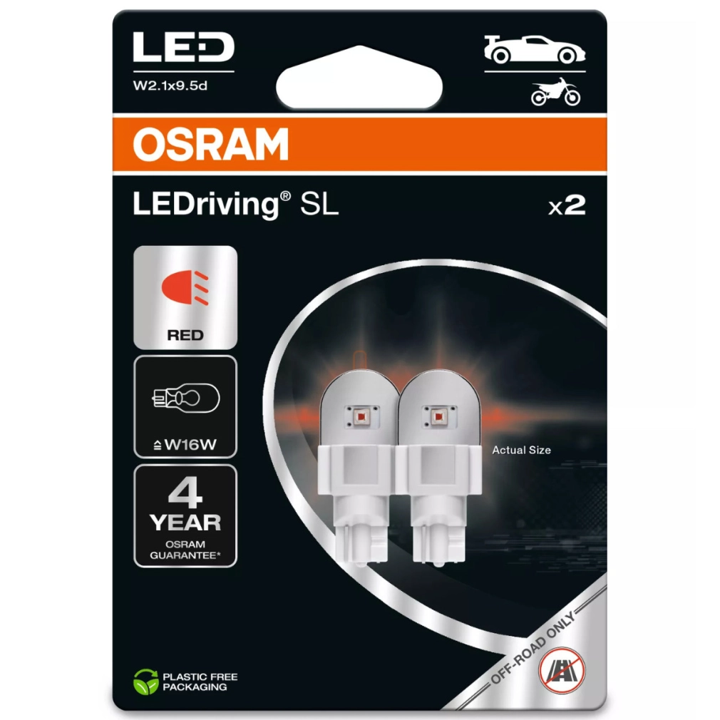 OSRAM LEDriving SL W16W RED, intenzív piros LED fény, energiatakarékos jelzőizzó, ≙ W16W cserelámpa, 921DRP-2BL