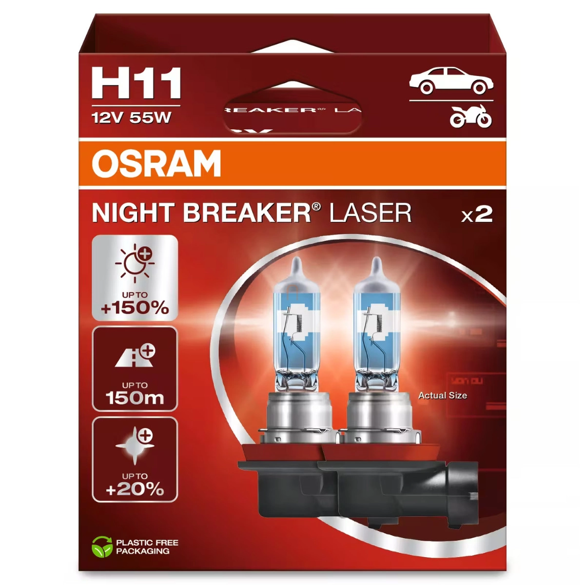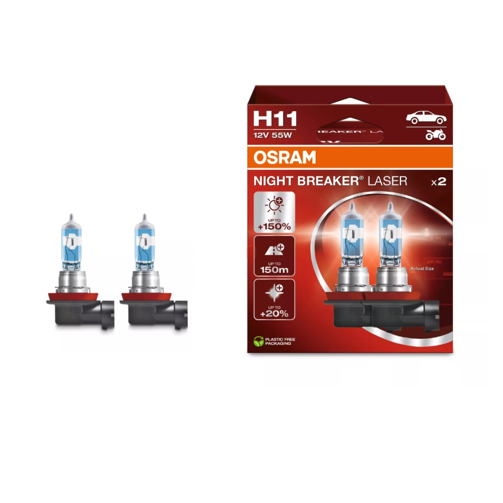 A legnagyobb gyártók versenyében született, a legsötétebb időkre tervezték. Az Osram Night Breaker Laser gen2 elég világos lesz ahhoz, hogy bármilyen útviszonyok közt biztonságos közlekedést nyújtson az éjszakai vezetés során. A Night Breaker Laser 150% Next Generation termékek a legerősebb világítási jellemzőkkel rendelkeznek. Az innovatív Laser technikának köszönhetően pontosabb világítási képet kapunk az előttünk megvilágított útszakaszon. A gyártói adatoknak megfelelően az új Night Breaker Laser +150% Next Generation izzók, 150%-kal fényesebbek a standard halogén izzókhoz képest. A kiemelkedő világítás értékek nagy részben a megújult gyártástechnológiai megoldásoknak köszönhetőek. Az emelt fényerősség mellett a színhőmérséklet is javult a standard halogénekhez képest, mégpedig 20%-kal fehérebb fényt kapunk, ha az új izzókkal világítunk. Mondhatjuk, hogy jól, hangzik, és ami fontosabb jól is fog kinézni. A lámpák burája speciális, pontos mintát követve került színezésre, a lehető legoptimálisabb fényerősség, és színhőmérséklet eléréséhez. Noha a világűrből még nem lesz látható az új Laser Gen2 család, de az aszfalton a maximumot nyújtja majd a prémium izzók kedvelőinek. A termékcsalád összes tagja ECE engedéllyel rendelkezik, közúti forgalomban használható. A régóta tartó sikeres Osram Night Breaker sorozat legújabb Laser Gen2 150%-os H11 izzója Tc szerinti 250 órás élettartamával vélhetően sikeresebb lesz bármelyik elődjénél. Ha a gyártó által megadott adatokat nézzük, a Night Breaker Laser 150% Next Generation izzókkal szerelt autók fényszórói akár 150 méterrel is távolabb világítanak a standard izzókkal szereltekhez képest, növelve a távolabbi tereptárgyak észlelését. Ha megfordítjuk a képletet, akkor minket is jóval korábban észrevesznek a szembe jövő autósok, ami számunkra szintén előnyt és biztonságot jelent. A fejeléstől függően 3500-4000K színhőmérsékletű Night Breaker Laser 150% Gen2 típusok elég fehérek lesznek ahhoz, hogy kontrasztosabb fényt adjanak, mint standard társaik és jobban kitűnjenek a közlekedésben növelve a biztonságot. Azok, akik az Osram Night Breaker Laser 150% Gen2 családot választják, nagyobb biztonságban érezhetik magukat az éjszakai közlekedés során. Természetesen, mint egyik csúcs izzót, az Osram Night Breaker Laser gen2-őt sem ajánljuk olyan autókba, melyek a magasabb töltőfeszültség miatt havonta tönkreteszik a normál izzókat is (pl.: Prius3, Auris), de normál körülmények között, átlagos autóhasználat mellett az Osram Night Breaker Laser gen2 több mint egy évig fog erőteljes fényt biztosítani Neked éjszaka.