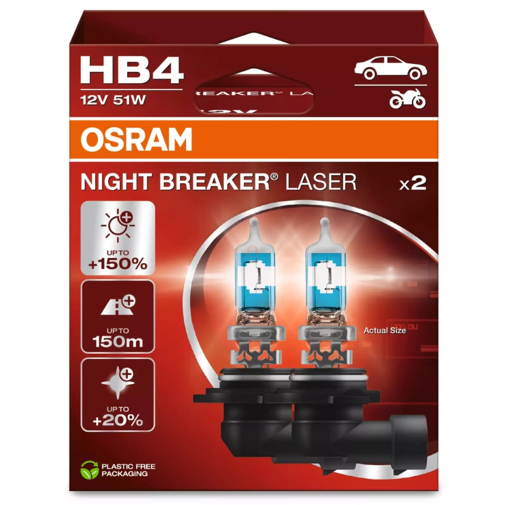 A legnagyobb gyártók versenyében született, a legsötétebb időkre tervezték. Az Osram Night Breaker Laser gen2 elég világos lesz ahhoz, hogy bármilyen útviszonyok közt biztonságos közlekedést nyújtson az éjszakai vezetés során. A Night Breaker Laser 150% Next Generation termékek a legerősebb világítási jellemzőkkel rendelkeznek. Az innovatív Laser technikának köszönhetően pontosabb világítási képet kapunk az előttünk megvilágított útszakaszon. A gyártói adatoknak megfelelően az új Night Breaker Laser +150% Next Generation izzók, 150%-kal fényesebbek a standard halogén izzókhoz képest. A kiemelkedő világítás értékek nagy részben a megújult gyártástechnológiai megoldásoknak köszönhetőek. Az emelt fényerősség mellett a színhőmérséklet is javult a standard halogénekhez képest, mégpedig 20%-kal fehérebb fényt kapunk, ha az új izzókkal világítunk. Mondhatjuk, hogy jól, hangzik, és ami fontosabb jól is fog kinézni. A lámpák burája speciális, pontos mintát követve került színezésre, a lehető legoptimálisabb fényerősség, és színhőmérséklet eléréséhez. Noha a világűrből még nem lesz látható az új Laser Gen2 család, de az aszfalton a maximumot nyújtja majd a prémium izzók kedvelőinek. A termékcsalád összes tagja ECE engedéllyel rendelkezik, közúti forgalomban használható. A régóta tartó sikeres Osram Night Breaker sorozat legújabb Laser Gen2 150%-os HB4 izzója Tc szerinti 500 órás élettartamával vélhetően sikeresebb lesz bármelyik elődjénél. Ha a gyártó által megadott adatokat nézzük, a Night Breaker Laser 150% Next Generation izzókkal szerelt autók fényszórói akár 150 méterrel is távolabb világítanak a standard izzókkal szereltekhez képest, növelve a távolabbi tereptárgyak észlelését. Ha megfordítjuk a képletet, akkor minket is jóval korábban észrevesznek a szembe jövő autósok, ami számunkra szintén előnyt és biztonságot jelent. A fejeléstől függően 3500-4000K színhőmérsékletű Night Breaker Laser 150% Gen2 típusok elég fehérek lesznek ahhoz, hogy kontrasztosabb fényt adjanak, mint standard társaik és jobban kitűnjenek a közlekedésben növelve a biztonságot. Azok, akik az Osram Night Breaker Laser 150% Gen2 családot választják, nagyobb biztonságban érezhetik magukat az éjszakai közlekedés során.