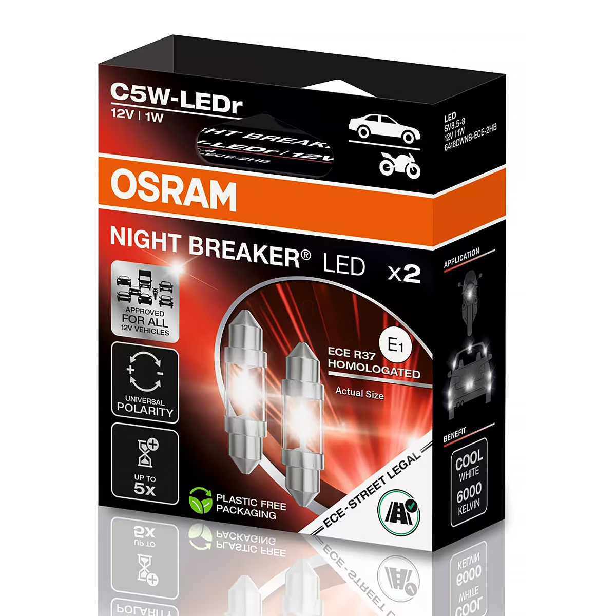 Osram Night BreakerLED C5W ECE egy prémium autós LED szofita/jelzőizzó, amely a hagyományos C5W halogén izzók helyett modern, fehér 6000 K színhőmérsékletű LED-fény kibocsátását biztosítja. Teljesen ECE R37 homologizált, így 12 V-os járművekben közúti használatra engedélyezett minden olyan helyen, ahol C5W izzó alkalmazható (pl. rendszámtábla, oldalsó helyzetfény, belső világítás). A LED technológia akár 80 %-kal kisebb energiafogyasztást és akár ötször hosszabb élettartamot kínál, mint a hagyományos izzók. Műszaki adatok: névleges feszültség 12 V, tesztfeszültség 13,5 V, teljesítményfelvétel 1 W, fényáram ~45 lm (±25 %), hossz 36 mm, átmérő 11 mm, SV8.5-8 foglalat, élettartam B3:1500 h, Tc:3000 h. Ez a cserelámpa modern, hidegfehér fényt ad, miközben alacsony fogyasztással és hosszú élettartammal javítja járműved világítását.