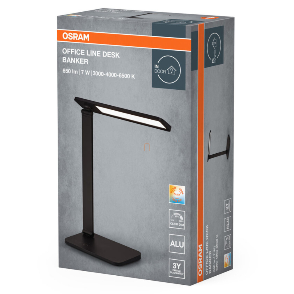 Szabályozható íróasztali LED lámpa, 37,4 cm - Osram Office Line Desk Banker, 3000/4000/6500 K, 418 lm, állítható fényerősség és színhőmérséklet, 7 W, 1,8 méteres kábellel, 220-240 V