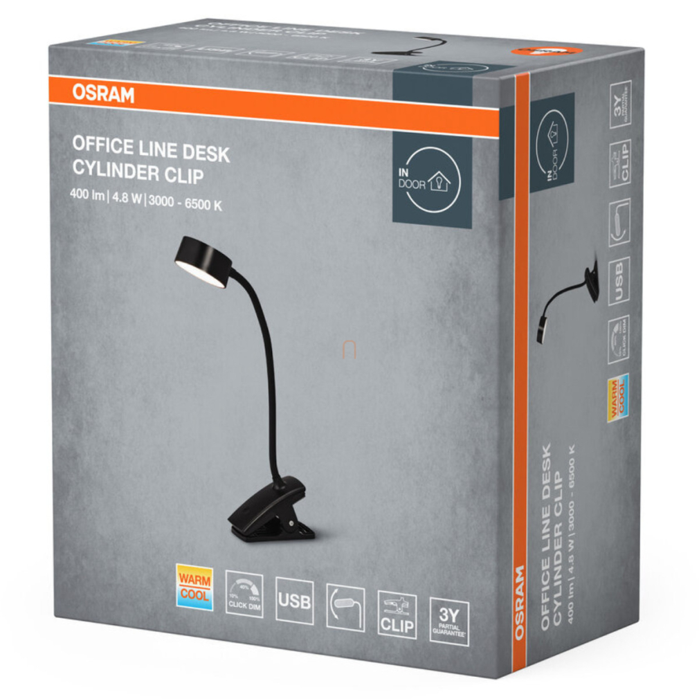 Szabályozható íróasztali LED lámpa, csíptetős, 30,5 cm - Osram Office Line Desk Cylinder Clip, 3000-6500 K, 221 lm, állítható színhőmérséklet, 4,8 W, 1 méteres kábellel, 220-240V