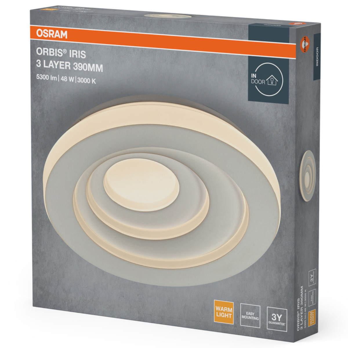 Modern design: A Ledvance Orbis Iris 3 Layer fehér színű mennyezeti lámpa 3 rétegű kialakítással, műanyag gyűrűvel.