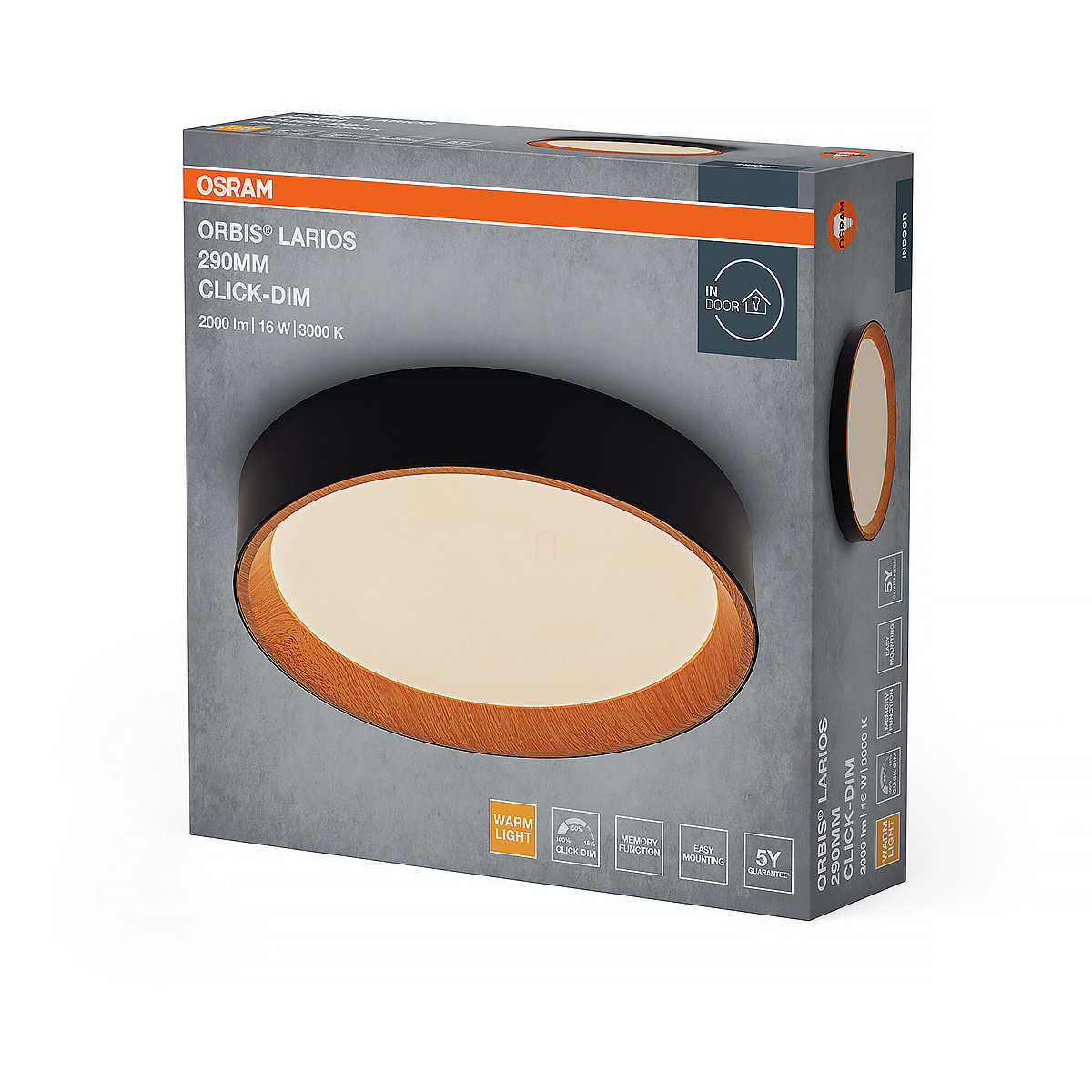 Osram Orbis Larios szabályozható mennyezeti LED lámpa, fa hatású, 16 W, 1000 lm, 3000 K, állítható fényerősség 3 fokozatban, fekete-barna