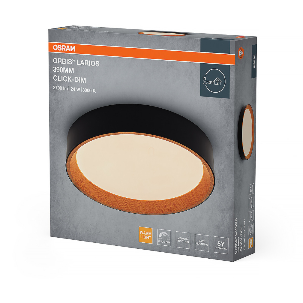 Osram Orbis Larios szabályozható mennyezeti LED lámpa, fa hatású, 24 W, 1450 lm, 3000 K, állítható fényerősség 3 fokozatban, fekete-barna