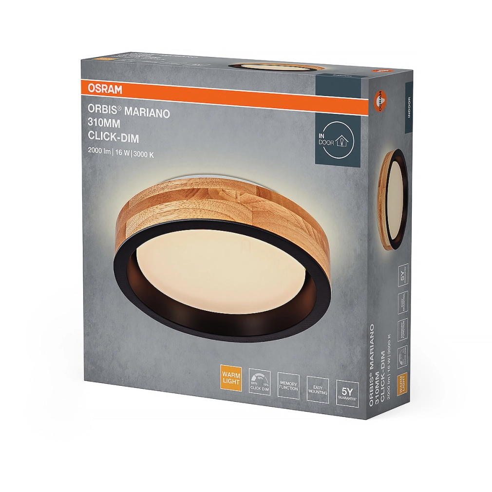Osram Orbis Mariano szabályozható mennyezeti LED lámpa, fa hatású, 16 W, 1000 lm, 3000 K, állítható fényerősség 3 fokozatban, fekete-barna