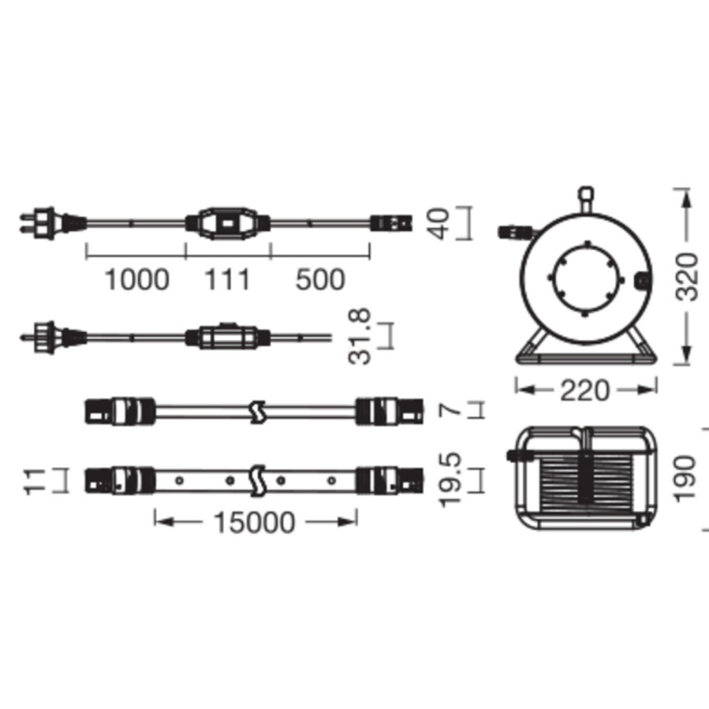 A termék 1,5 m kábellel és dugóval van felszerelve. Kábeldob mellékelve a könnyű tároláshoz. Szerelési kiegészítők a csomagban.