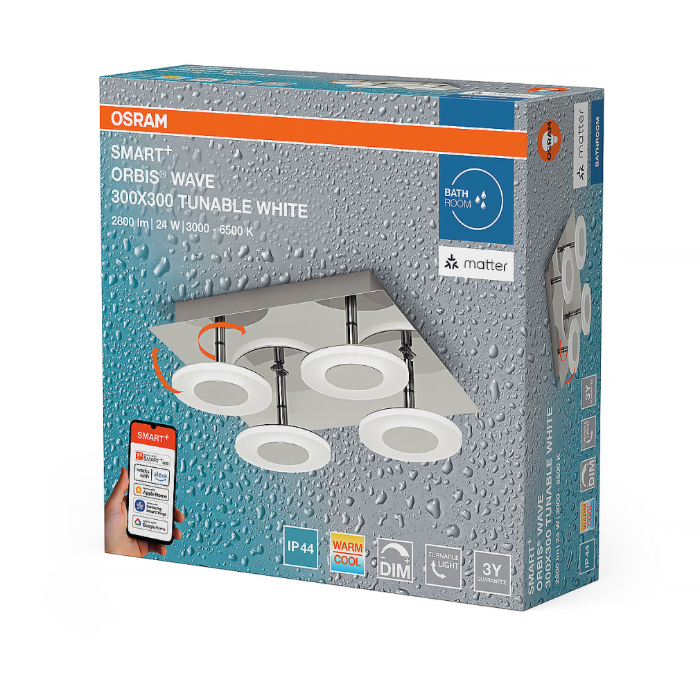 Osram Smart + Matter Orbis Wall Wave szabályozható fürdőszobai mennyezeti LED lámpa, 24 W, 1500 lm, 3000-6500 K, dimmelhető