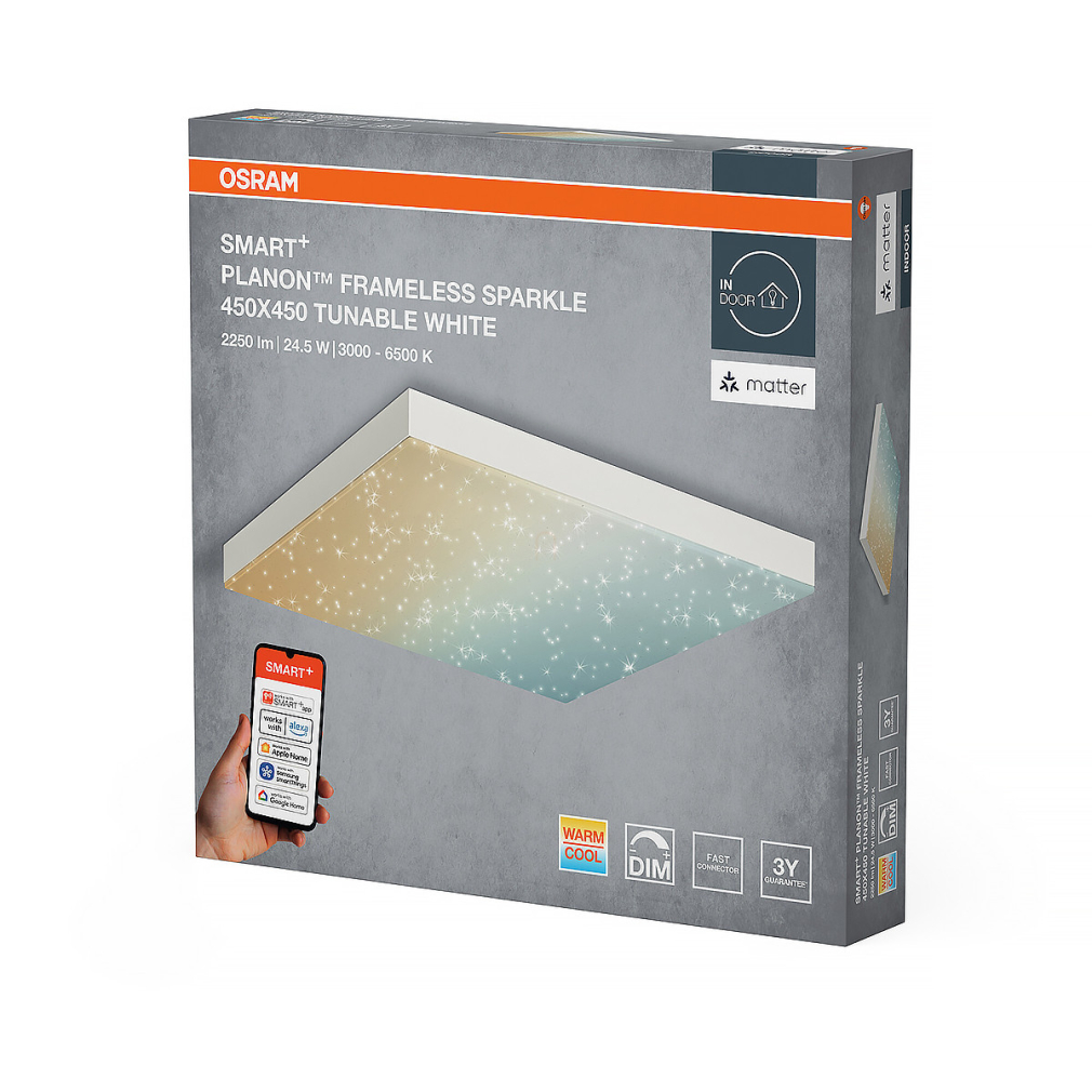 Osram Smart + Matter Planon Frameless Sparkle szabályozható mennyezeti LED panel, 24.50 W, 1300 lm, 3000-6500 K, változtatható fényerősség és színhőmérséklet