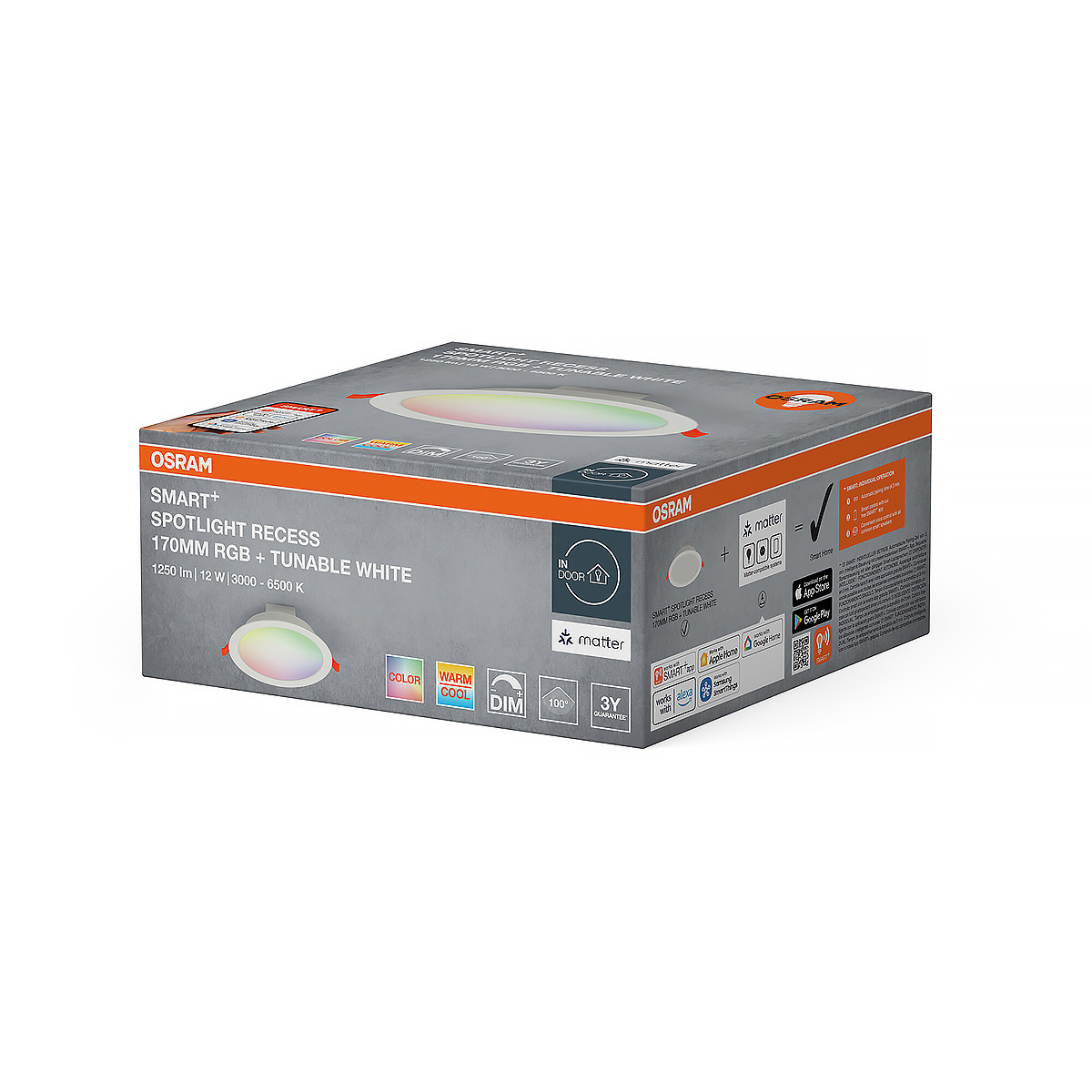 Osram Smart + Matter Recess Downlight szabályozható süllyesztett LED lámpa, 12 W, 1200 lm, 3000-6500 K, változtatható fényerősség és színhőmérséklet