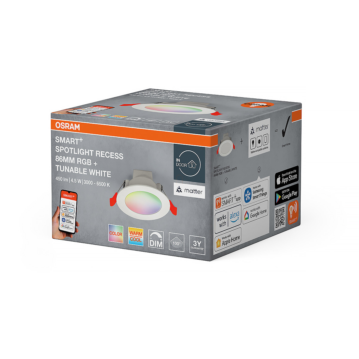 Osram Smart + Matter Recess Downlight szabályozható süllyesztett LED lámpa, 4.50 W, 300 lm, 3000-6500 K, változtatható fényerősség és színhőmérséklet