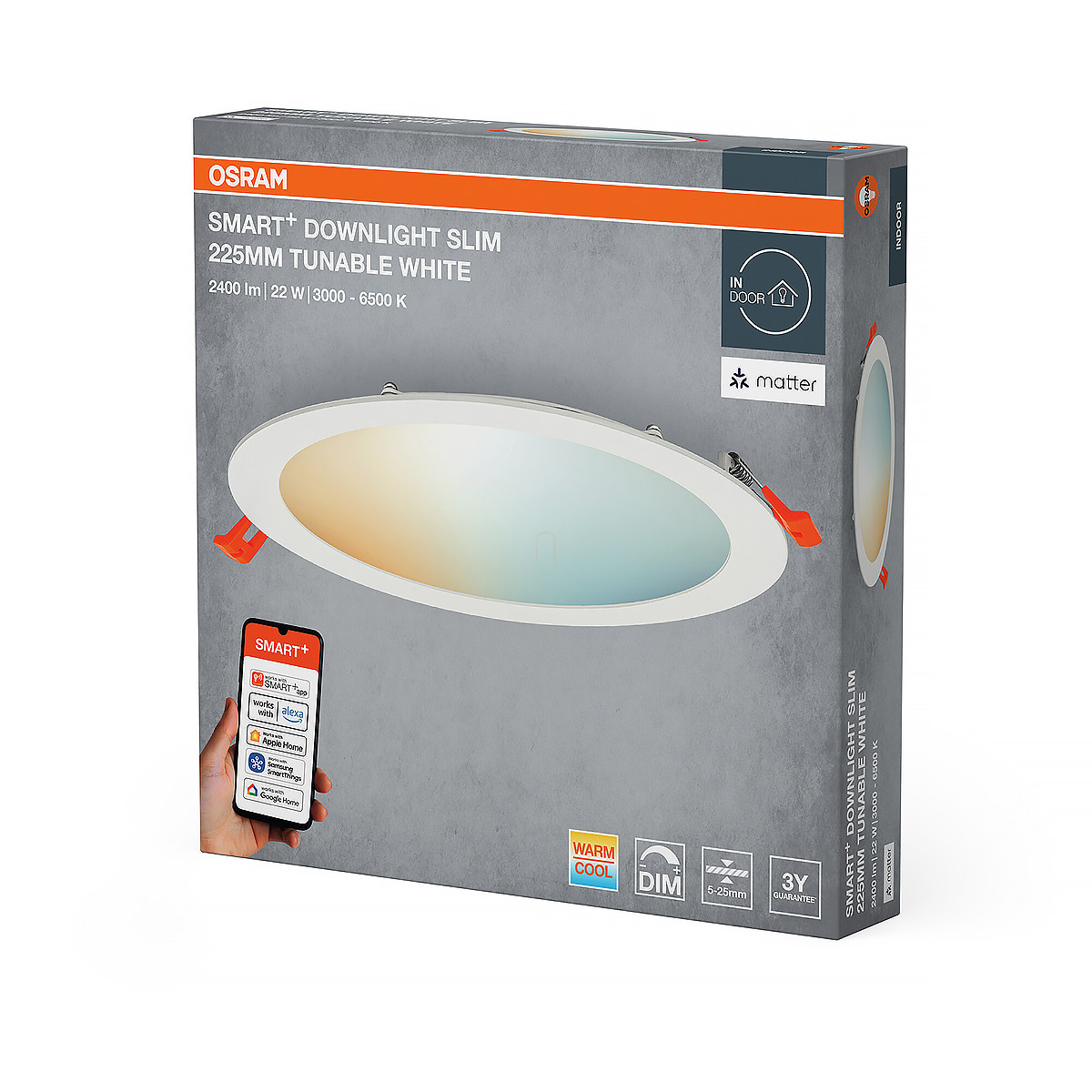 Osram Smart + Matter Recess Slim Downlight szabályozható süllyesztett LED lámpa, 22 W, 2000 lm, 3000-6500 K, változtatható fényerősség és színhőmérséklet