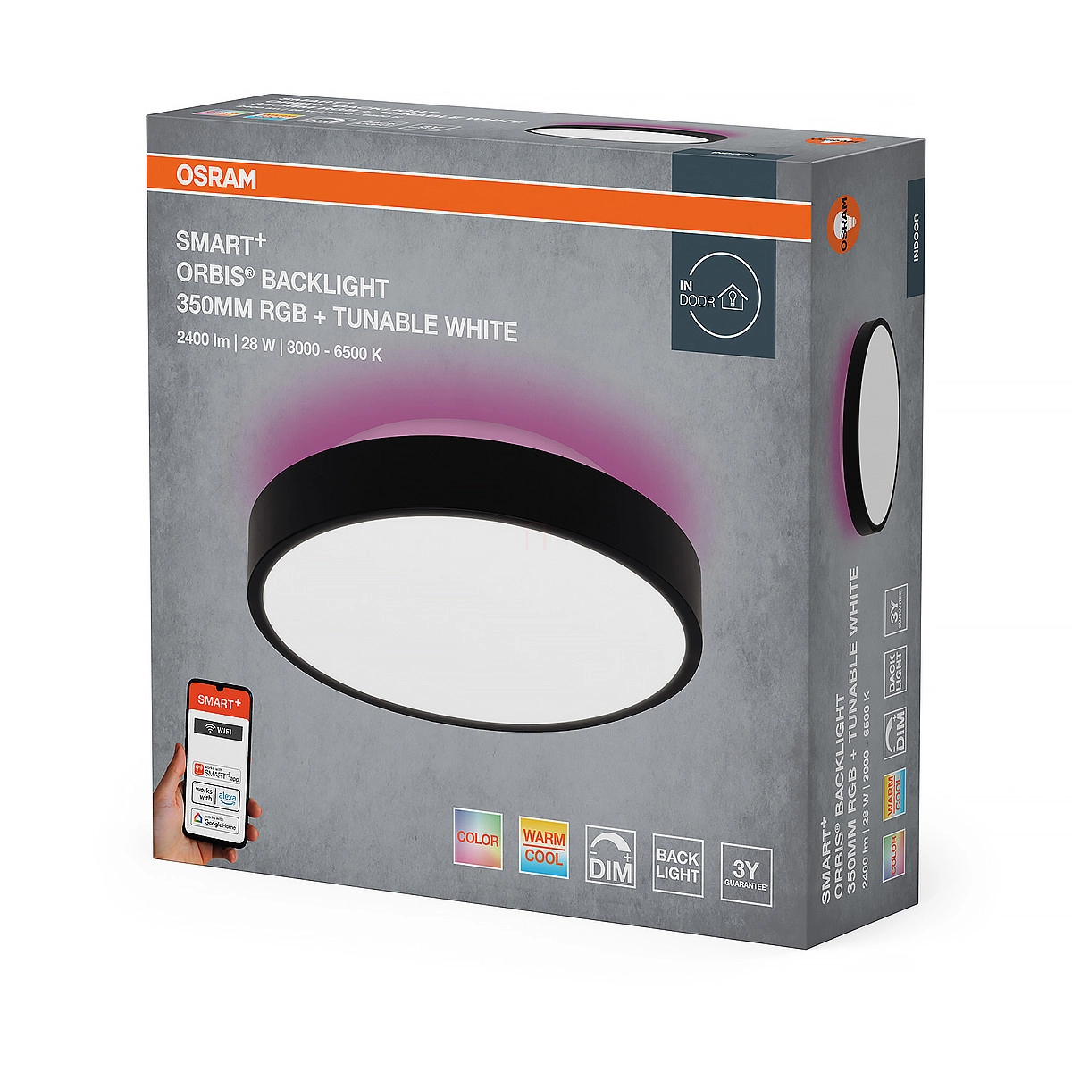 Osram Smart + Orbis Ceiling szabályozható mennyezeti LED lámpa háttérvilágítással, 28 W, 1400 lm, 3000-6500 K, változtatható fényerősség és színhőmérséklet, fekete